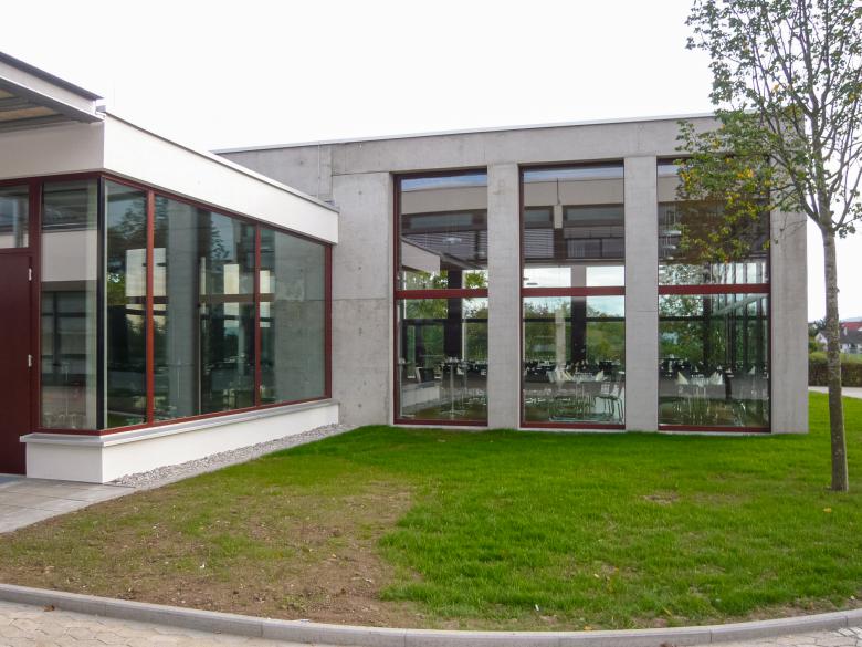 Unser Büro war zuvor bereits mit der Sanierung der Fassaden der Schulturnhalle sowie der Flachdächer derselben Schule befasst gewesen. Der Neubau der Schulmensa wurde gemeinsam mit dem Stuttgarter Büro Zoller Architekten umgesetzt.