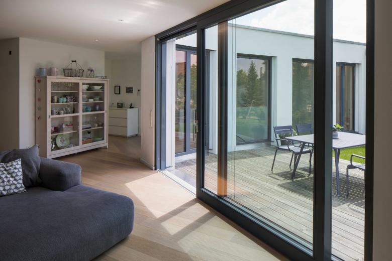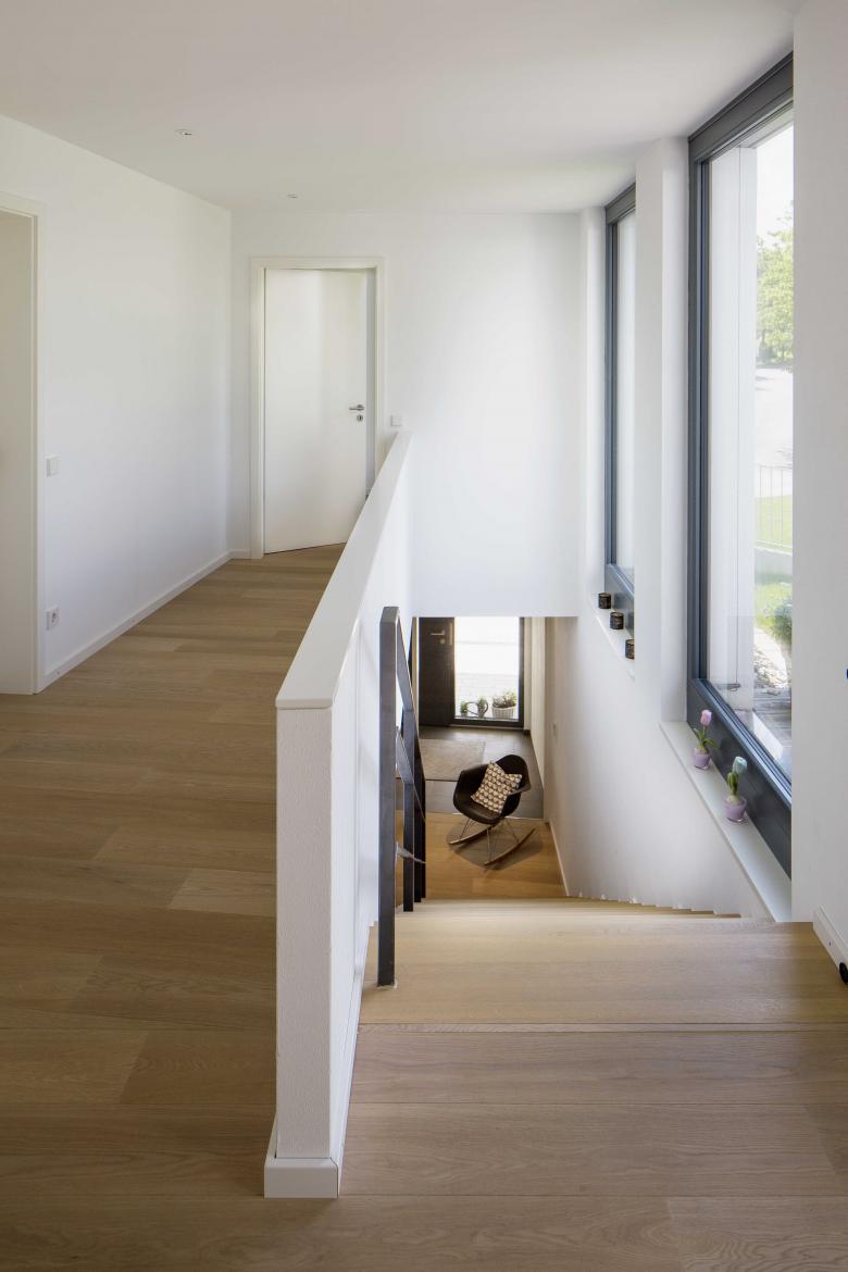 Auf Ebene null mit Hauseingang und Doppelgarage befinden sich Wellnessbereich, Gäste-WC, Gebäudetechnik sowie Abstell- und Kellerräume. Die Ebene plus eins mit Schlafzimmern und kombiniertem Küche-, Ess- und Wohnbereich besitzt raumhohe, großflächige Fenster, die das Gebäude zum leicht abfallenden Garten hin öffnen.