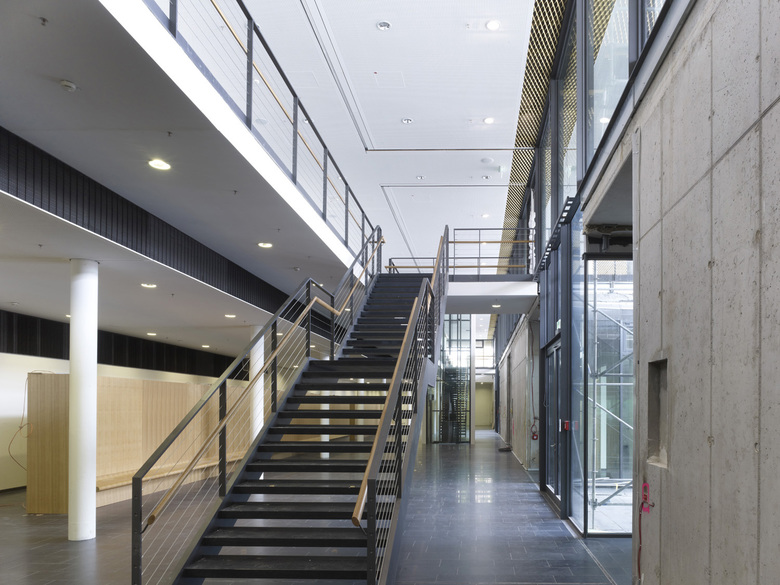 Das Otto-Stern-Zentrum als zentrale Mitte des Campus Riedberg. Stadträumlich ist eine anspruchsvolle Wegebeziehung von der S-Bahn-Station zum Campus Riedberg entwickelt. Ein zweigeschossiges Foyer ermöglicht durch den geschosshohen Höhenunterschied eine jeweils ebenerdige Erschließung von den beiden begrenzenden Straßen. Das Hörsaalzentrum bildet, die sichtbare Baumasse deutlich verringernd, den Sockel als begehbare Platzfläche mit großer Freitreppe und erhält über Gartenhöfe seitliches Tageslicht. Das als Verteilerebene verglaste Foyer markiert die Fuge zum darüber liegenden, goldfarbenen, scheinbar schwebenden, metallverkleideten Baukörper, in dem sich die zentrale Bibliothek befindet.