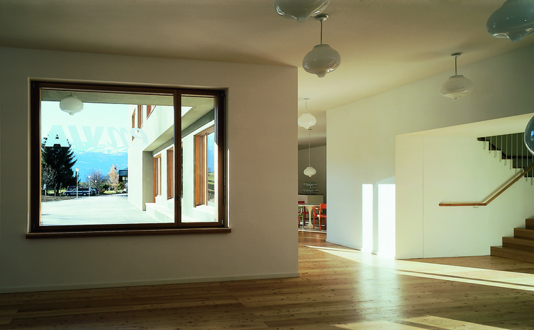 Über den einladenden Vorplatz gelangt man in die Eingangshalle von wo sich die öffentlichen Räume des Erdgeschosses als zusammenhängendes Raumkontinuum entwickeln.