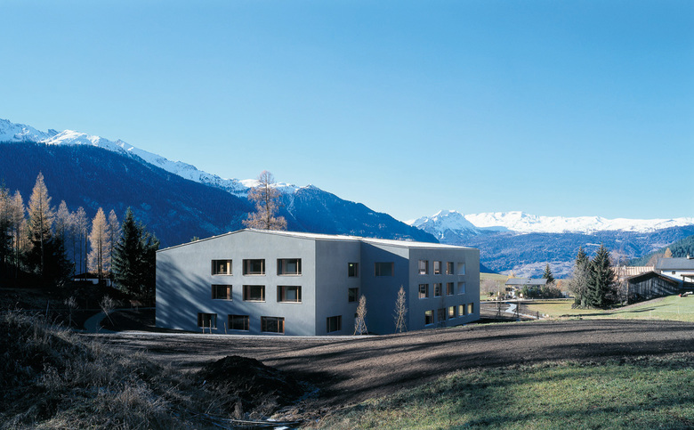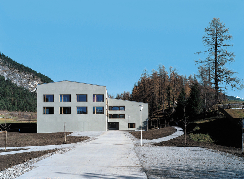 In einer leichten Talsohle nahe dem historischen Zentrum von Alvaneu gelegen, bildet der winkelförmige Bau des Altersheimes zusammen mit dem angrenzenden Hügelzug einen räumlich gefassten Aussenraum und verankert sich so in der weiten Mulde.