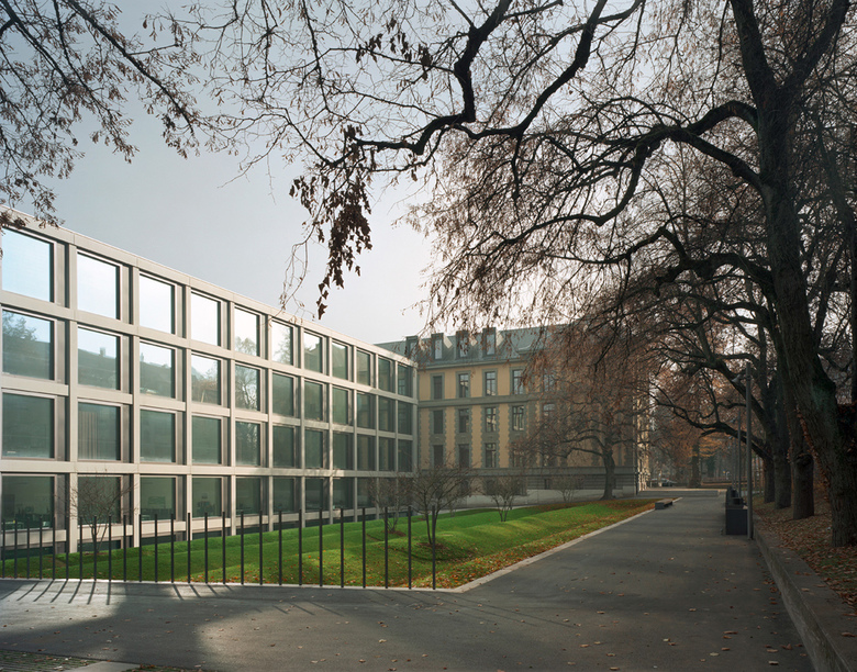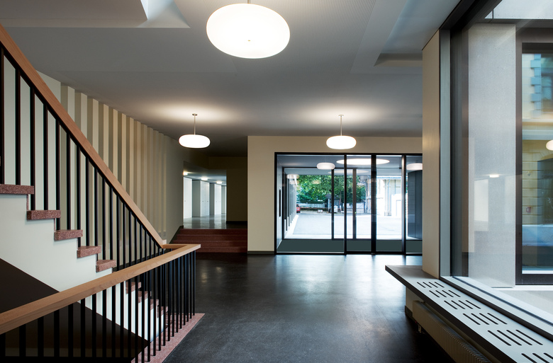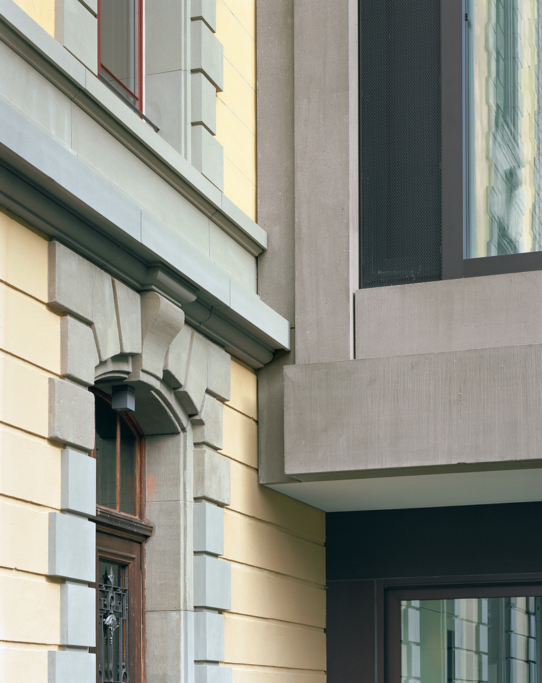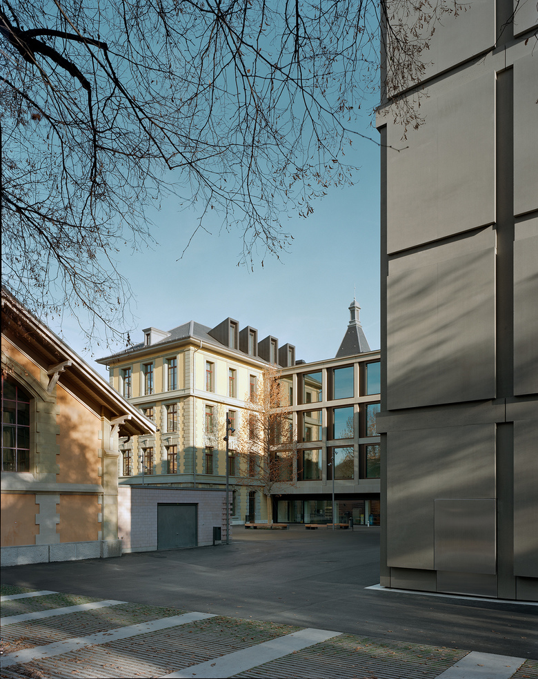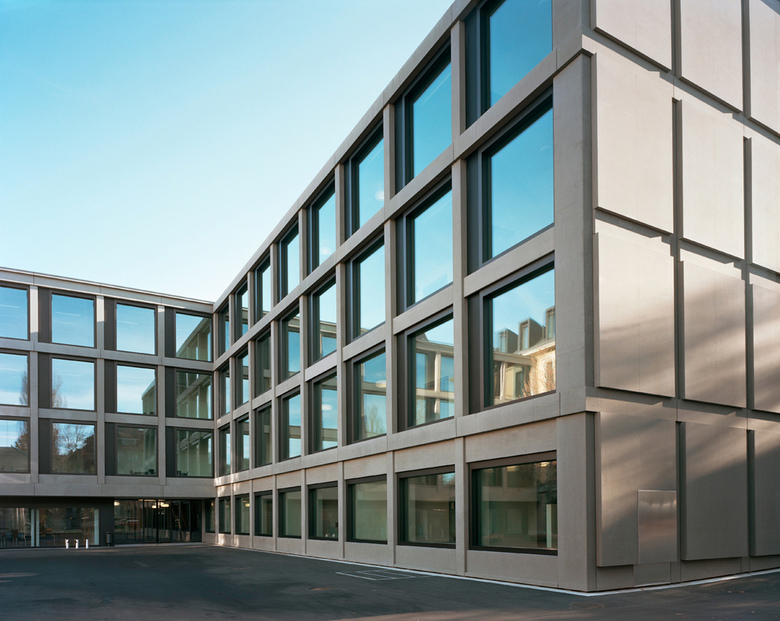Erweiterungsbau mit Unterrichts-, Gemeinschafts- und Administrationsräumen / Ein winkelförmiger Neubau übernimmt Geschosshöhen und Typologie der Schule von Otto Lutsdorf (1906) und ergänzt diese zu einer neuen Gesamtfigur / Der Neubau gliedert den bestehenden Aussenraum in drei unterschiedliche Höfe / Im Innern wird eine betrieblich vorteilhafte Erschliessung etabliert / Vorfabrizierte, eingefärbte Betonelemente prägen das Fassadenrelief des Neubaus und sind Mittler zur plastisch ausgebildeten Sandsteinfassade des Bestandes.
