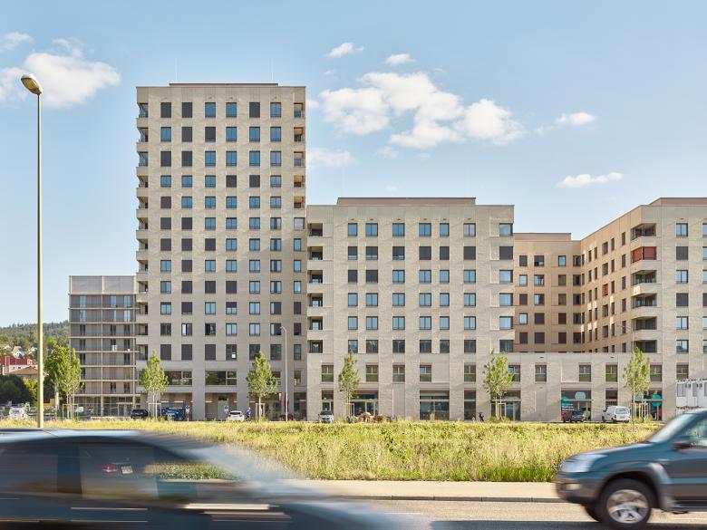 Nutzung: 215 (darunter 78 altersgerechte) Wohnungen, Pflegezentrum (30 Zimmer), Gewerbe, Tiefgarage