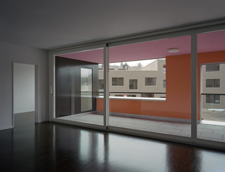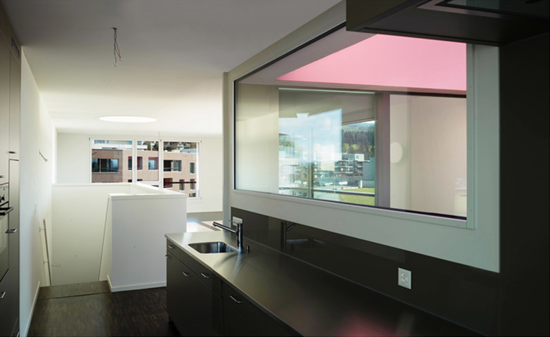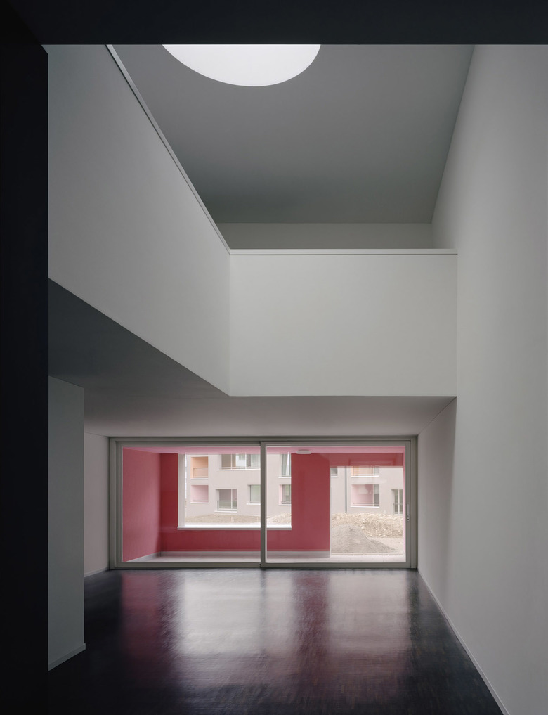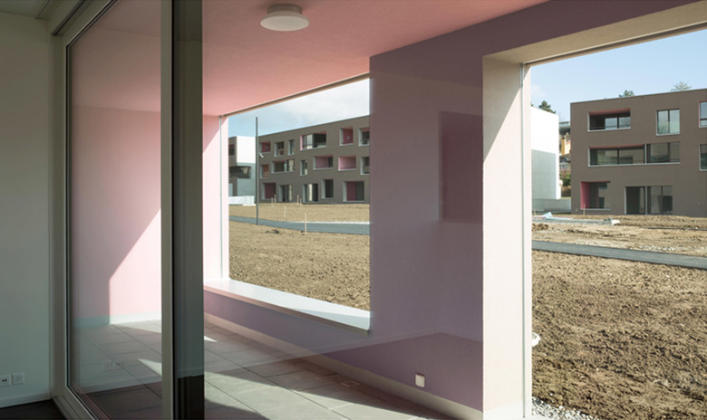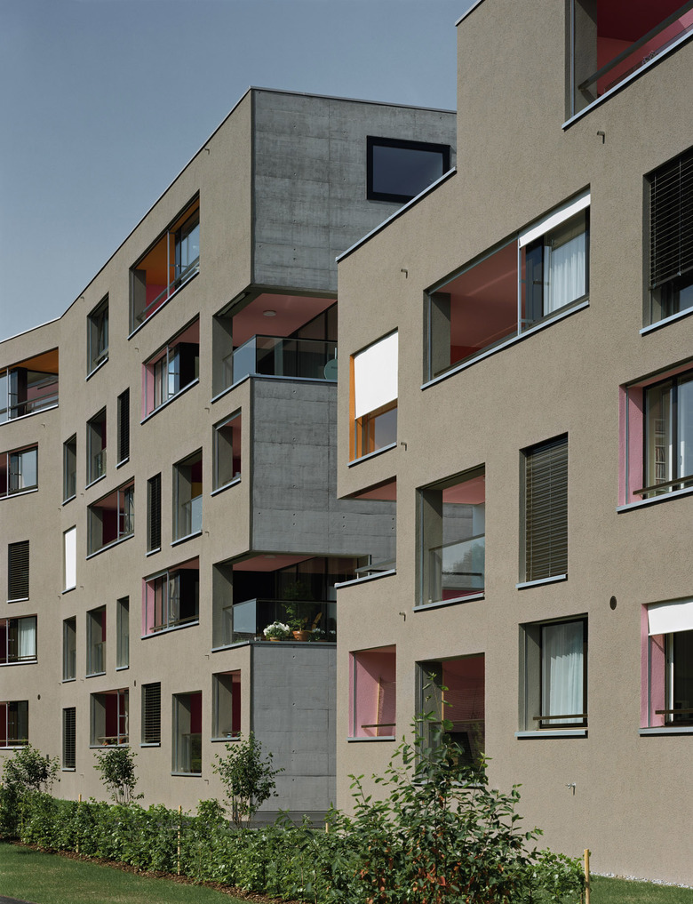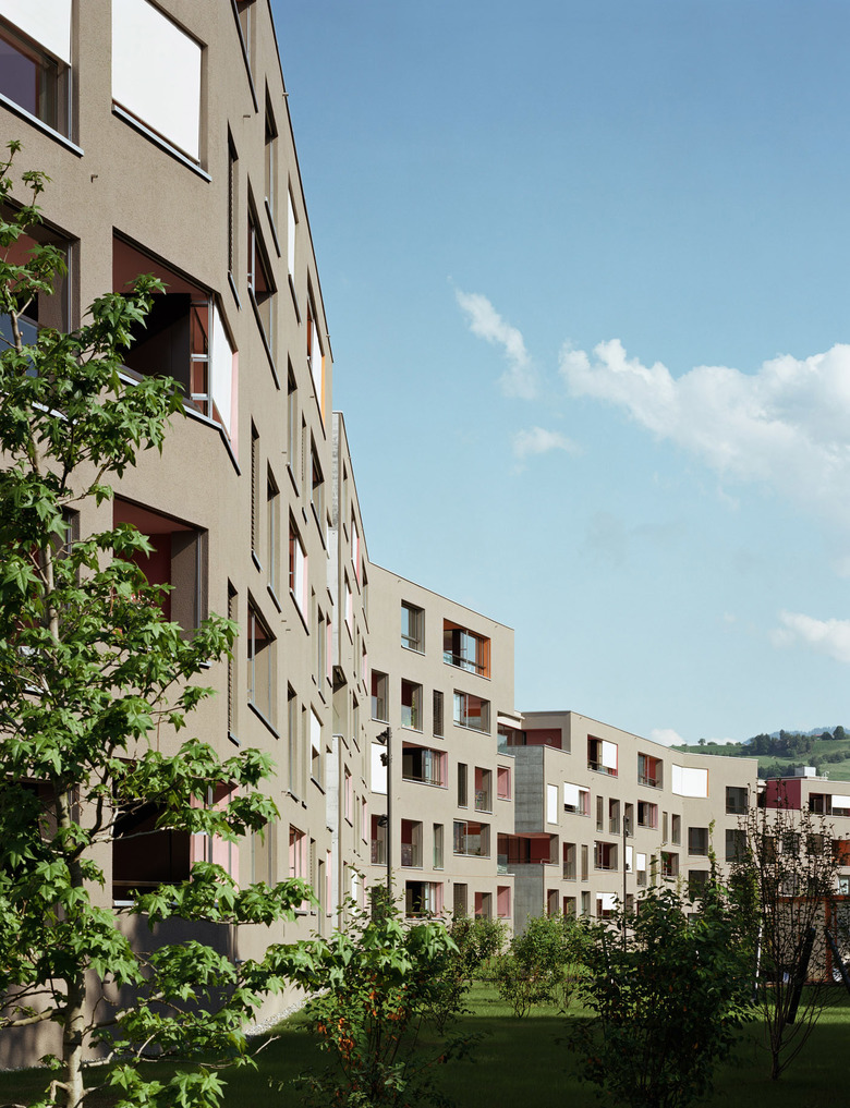Zwei lange, segmentierte, mehrfach gewinkelte und höhengestaffelte Zeilen schaffen einen Binnenraum, der sich nach Süden zur Landschaft öffnet / Baumsorten und Sträucher von unterschiedlicher Farbigkeit und Blüte prägen einen „Zauberwald“, in welchen partiell private Gärten eingelagert sind / Die Vielfalt an angebotenen Wohnungstypen ist in einer einenden Architektursprache aufgehoben / In Perlmutt- und Korallenfarben gestrichene Loggien- und Fensteröffnungen kontrastieren mit den in dunklen Sepiatönen verputzten Gebäudekörpern.