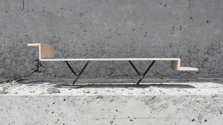 Der Tisch besteht aus zwei Grundelemente: Eine gefaltete Holzplatte sowie Y-Stützen aus unbehandelten geschweißten Metall. Die großen runden Fußplatten nehmen die Drehmomente des Tisches auf. Die Y-Stützen reduzieren die Spannweite der Tischplatte.
