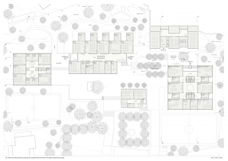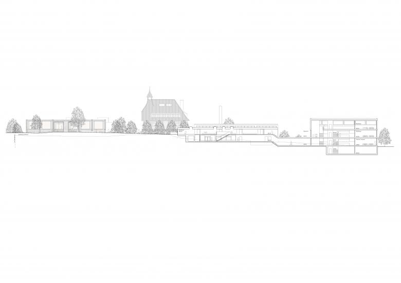 Die bestehende Primarschulanlage wird geprägt das denkmalgeschützte Schulhaus Hämisgarten im Heimatstil von 1907 welches als Solitär im Obstgarten konzipiert wurde, sowie das schutzwürdige Schulhaus Talholz (1958-61) der Basler Architekten Raser & Vadi, welches den Einzug der Moderne im Bauerndorf repräsentiert. Die beiden Gebäude stellen zwei für die jeweilige Baukultur im Schulhausbaus typologisch und gestalterisch herausragende Beispiele dar, welche sich souverän in den landschaftlichen Kontext und der Topografie einbetten. Trotz der typologischen und formalen Unterschiedlichkeit und deren Solitärcharakteristik gelingt es Raser & Vadi, mit der Einführung einer baulichen Plattform, ein in der Topografie eingebettete identitätsstiftendes Schulensembles. Die beiden neuen Baukörper flankieren die Bestandsbauten. Das geforderte Raumprogramm wird in zwei kompakte Baukörper organisiert. Durch das Versammeln der fünf Gebäude um das zentrale Schulplateau entsteht ein erkennbares, zusammenhängendes Schulareal mit differenzierten Aussenräumen und Adressen. Im Gegensatz zum Bestand werden die Neubauten als flexible, wandelbares Raumgitter konzipiert. Die beiden Neubauten verweisen mit Ihrer Schnitttypologie betreffend Raumbelichtung und Belüftung auf die für den Schulbau der Nachkriegsmoderne in der Schweiz typischen zweiseitig belichteten, zweibündige Korridortypus, wie ihn exemplarisch das Talholzschulhaus repräsentiert. Das Betreuungshaus stellt eine horizontale addierte Form des Typus dar. Dem neuen Schulgebäude dagegen gelingt mit der Einführung des Splittlevels um die zentrale Halle eine vertikale Adaption des Prinzips. Die typologische Grundstruktur der neuen Gebäudes ermöglicht altersgerechte wandelnbare Unterrichtsformen vom klassischen Frontalunterricht in der Kerngruppe, bis zum klassenübergreifenden Arbeiten in der offenen Lernlandschaft. Alt und Neubauten treten in einen respektvollen Dialog und werden zu einem zusammenhängendes Schulensemble geformt.