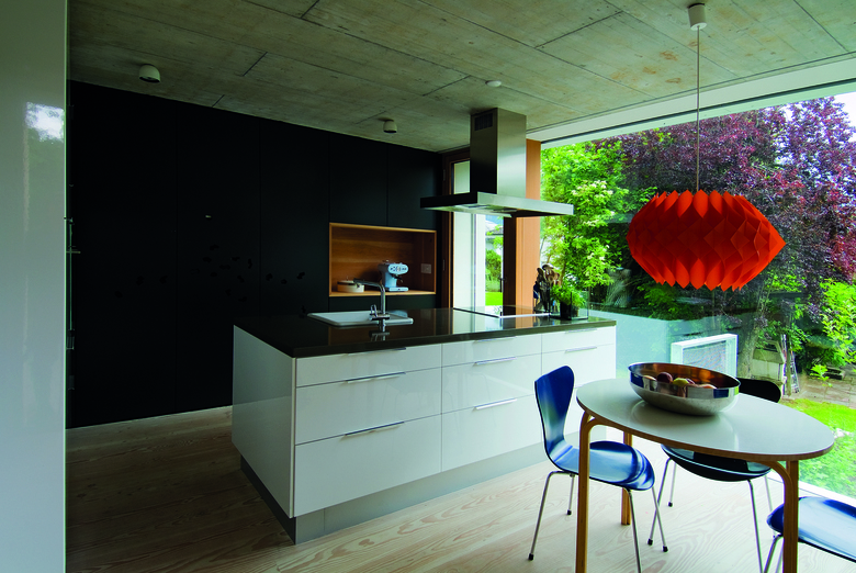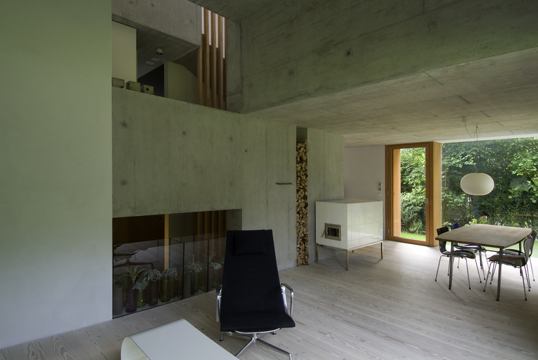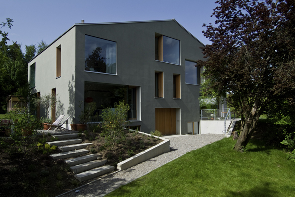 Direkt am Waldrand, ganz oben im Quartier Gartenstadt Köniz, liegt die ungenutzte Parzelle. Die baurechtlichen Vorgaben hinsichtlich Volumetrie und Gestaltung waren einschränkend. Dies führte zu einem kompakten, von den zentralen Erschliessungen her – gartenstadttypologisch – entwickeltem Konzeptansatz. Versetzte Geschosse thematisieren das fallende Terrain und ermöglichen spannungsreiche Raumfolgen und Durchblicke. Eine fein-verputzte Fassade mit grossflächigen, ebenfalls versetzten Lochfenstern, zusammen mit dem einfachen Volumen und dem bündigen Satteldach bewirken einen zeitgemässen städtischen Bautypus.
