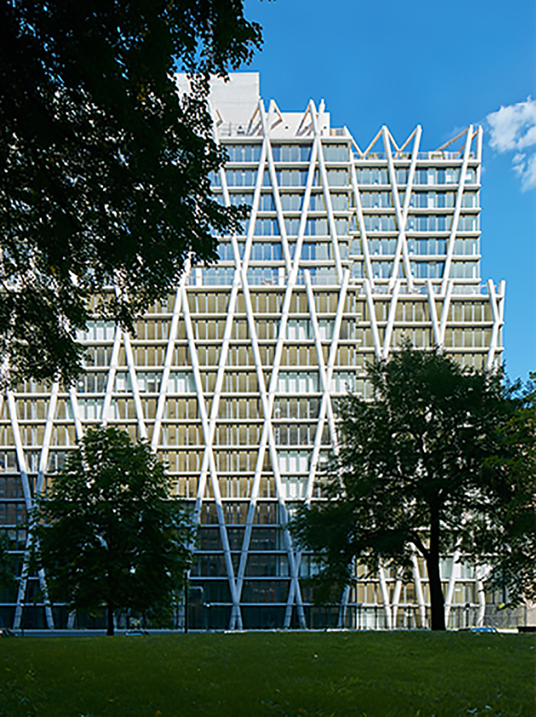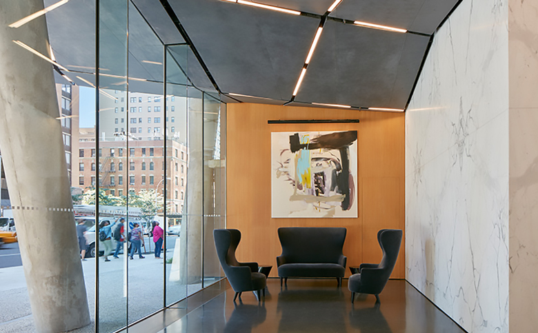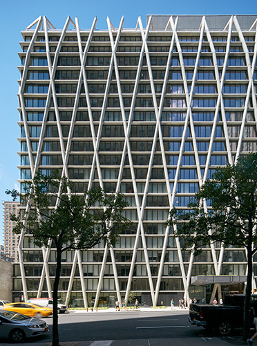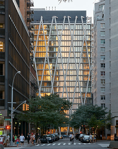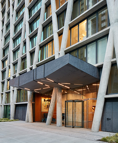 Creating a new terminus for W68th Street, 170 Amsterdam sits between Central Park to the east and the landscaped open space of the Lincoln Towers superblock to the west. The building’s architecture and the exoskeleton that defines the exterior is derived from its location between these large green spaces and its immediate context. The intersections of the structure rise to the top of the building at different heights, giving the appearance of a façade in motion while also allowing for the prefabricated fiberglass formwork to be reused with the concrete cycle. Moving the structure to the outside of the enclosure freed up valuable interior space that would have been occupied by columns and the projecting slabs and columns provide a veil over the all glass façade and act as a shading device. The deep façade of the diagrid connects with the muscular buildings of lower Amsterdam Avenue, Lincoln Center, and the Upper West Side. At ground level, the columns create a dynamic streetwall, with the exposed structure angling into the sidewalk and piercing the solid form of the building canopy.