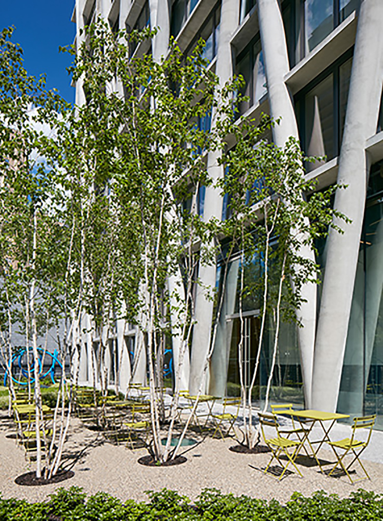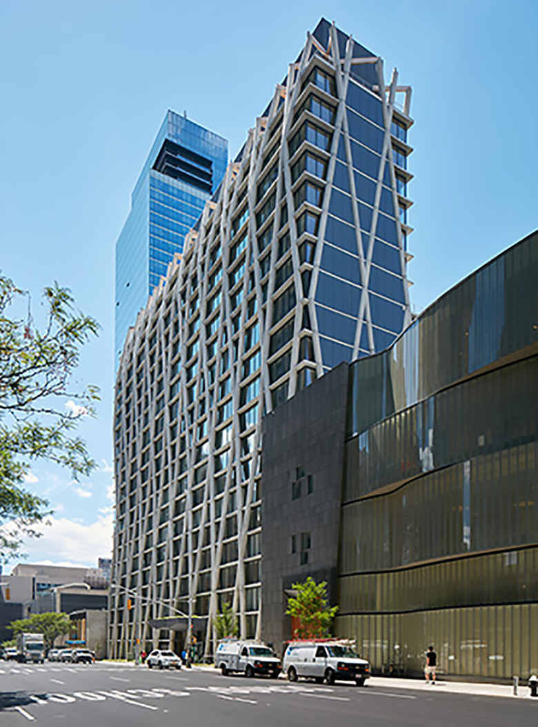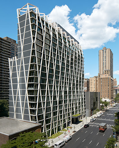 The concrete used to create the exoskeleton is the result of a specialized mix that gives the material the appearance of limestone, a nod to the buildings in the Lincoln Square neighborhood. The formwork for the round, crossed column shapes involved an intricate fiberglass system with multiple units that were tightly connected together to achieve maximum reuse and economy. The form system and the reinforcing were designed so a pump-placing tube could be inserted into the crossed shapes, which achieved a smooth and consistent surface without blemishes or discoloration. Using a small aggregate mix enabled the concrete to be placed into the blind areas of the formwork with no vibration. The concrete mix was a dense, high fluid self-consolidating mix, using gray cement and slag to achieve a light gray finish and meet LEED standards.