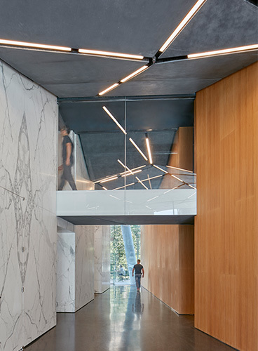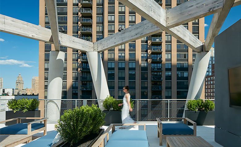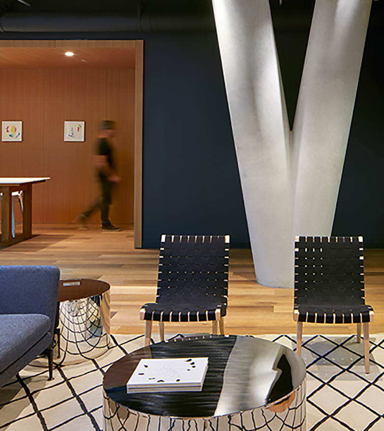 At the top, the building’s volume ends while the skeleton continues, creating a structural canopy for the rooftop spaces. Inside, the exposed concrete columns angle through the public spaces of the building piercing the floors and walls of the lobby, common rooms and corridors, and disappearing into the ceiling above. In the apartments, seeing the structure through the floor-to-ceiling glass has the effect of being suspended in a treehouse, held up by the branches of the building’s exoskeleton.