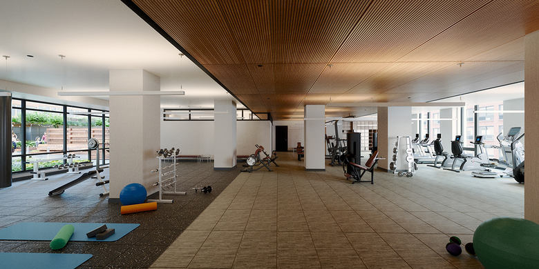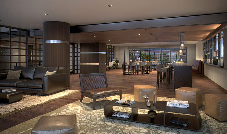 The building amenities are extensive. Indoor amenities include: gym with fitness studio, massage room and nutritionist office; golf room; spa; screening room; library; gaming room; pet grooming area; sports bar; business center; bike room; and party room. Outdoor amenities include: bocce pitch; shuffleboard court; ping-pong tables; grill and dining area with a fire pit; outdoor class & flexible space; party room; kitchen; and lounge.
