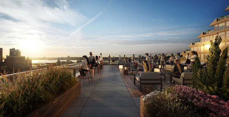 The building’s mass has been shifted toward the center of the block, away from the Avenues, and ascending from De Witt Clinton Park on the western side. It has also been shifted to the 53rd Street side of the block, north toward the larger Mercedes House project, to allow the weighting along 52nd Street to remain lower-rise and contextual. Separating the 52nd and 53rd Street volumes is a central open space, allowing light and air to flow between the volumes, and between the adjoining buildings to the east and west.