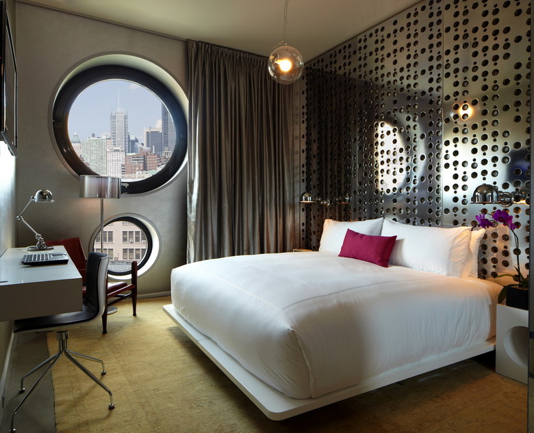 Originally designed for the Maritime Union in 1966, the building was converted into a hotel, which created design opportunities as well as constraints. The original façade was punched with porthole windows to express the maritime program, and these were kept and expanded upon. The portholes became central to the design and the surreal quality they create. The original through block building offered limited possibilities for natural light, so four floors were removed from the center of the building, which created a new pool terrace and beach, new windows and balconies for guestrooms, along with two new floors of guestrooms on the southern portion of the building. To the north, a glass enclosed roof-top lounge and terrace was created. The glass bottom pool, dotted with portholes of its own, allows guests in the lobby glimpses through the water to the outside (and vice versa), and connects the spaces in an ethereal way. Light wells framed in teak between the lobby, pool and lower levels allow the guest to be transported between spaces. Two hundred hand blown glass globes float through the lobby and congregate over The Marble Lane restaurant filling the space with a light cloud.