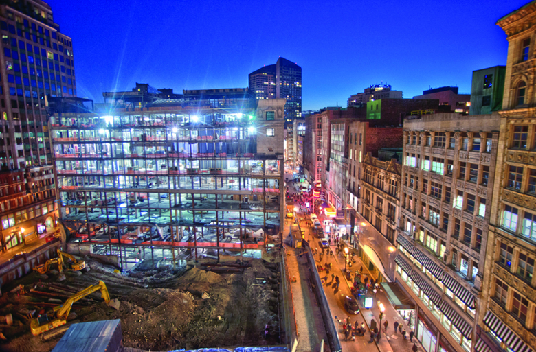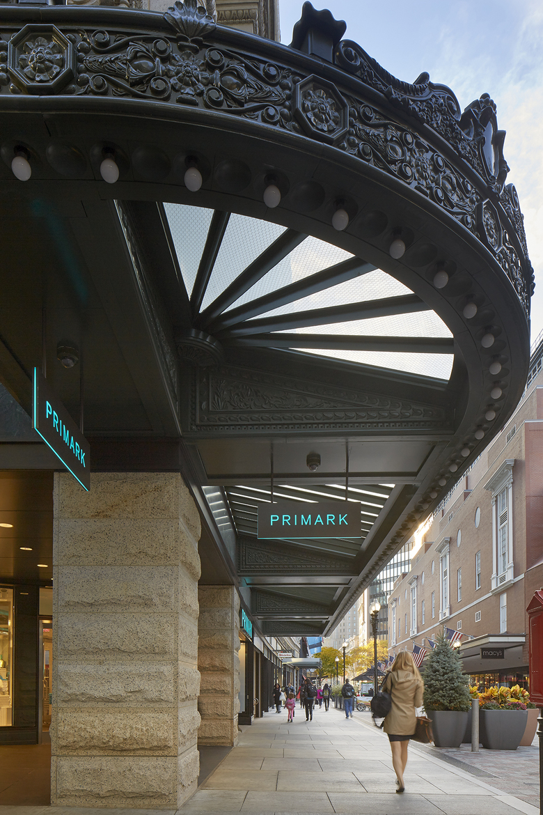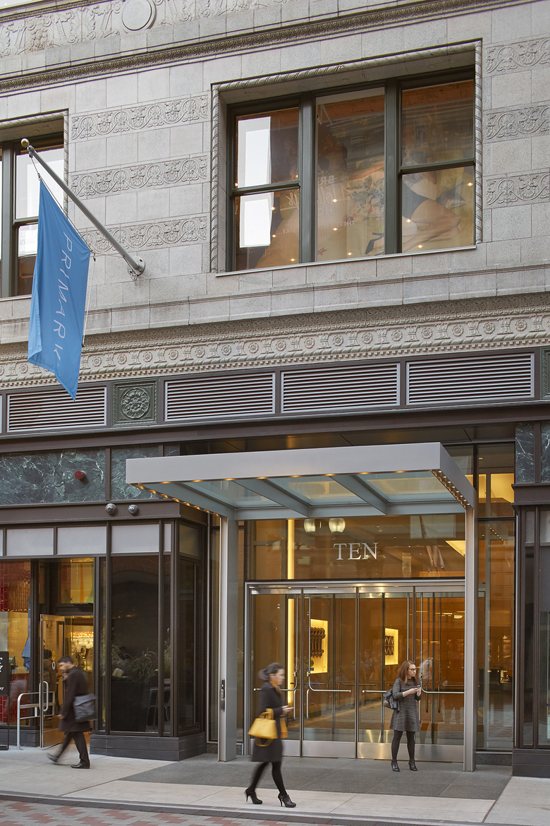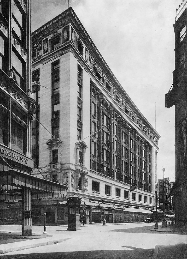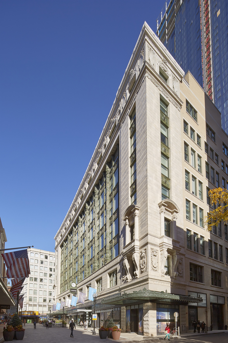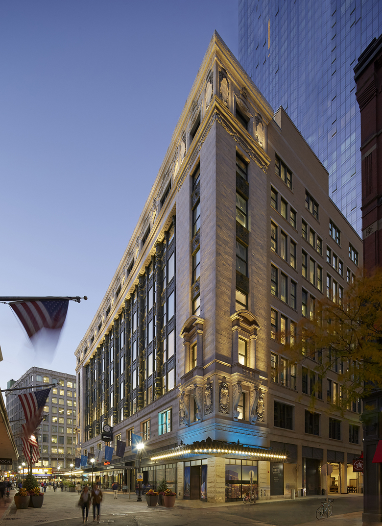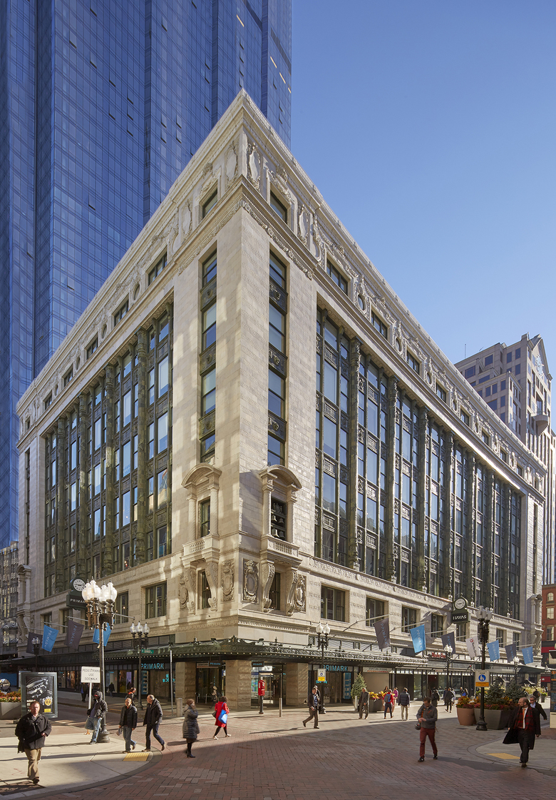 Chicago architect Daniel Burnham’s last building, and only building in Boston, was completed in 1912 as a flagship store for Filene’s Department Store. The building was added to the National Register of Historic Places in 1986, and in 2012, a Handel Architects-led team was commissioned to restore the existing façades, as well as design a replacement façade for the building’s north side. Upper floors were converted to office, and are now occupied by the French advertising firm Havas, and a new lobby was added.