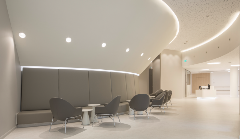 Ein menschengerechtes Raumprogramm, sanft schwingende Flächen, ausgefeilte Details und ruhige Oberflächen kreiieren die wohltuende und professionelle Atmosphäre.