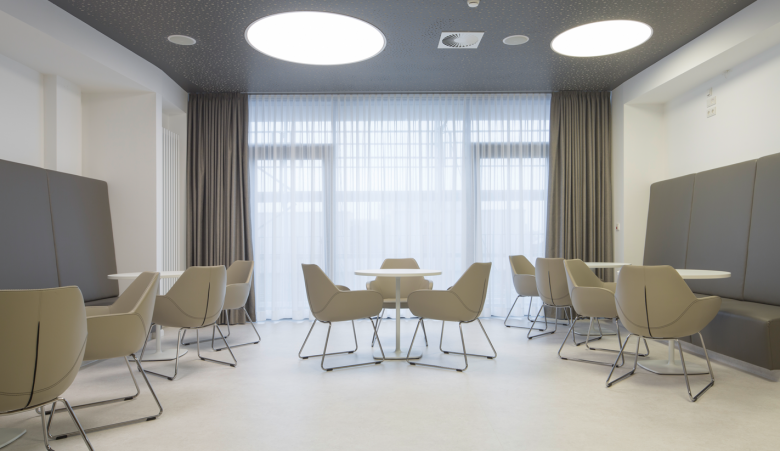 Neu geschaffene Lichthöfe in den Fluren geben den Blick frei in den Himmel und Minigärten. Die Rechtwinkligkeit üblicher Kubaturen wird durch die Innen-Architektur gebrochen. Architektur trifft Natur. Sympathische Rundungen aus Holz und interessante Lichtgestaltung prägen den Eindruck. Der vom Innenarchitekten entwickelte, sandfarbene Bio-Boden wirkt wie vom Winde umfächelt. Kissenartige Holzelemente weisen den Weg zu den Patienten-Zimmer. Auch die Zimmer sind gleichermaßen funktional, wie edel-minimalistisch.