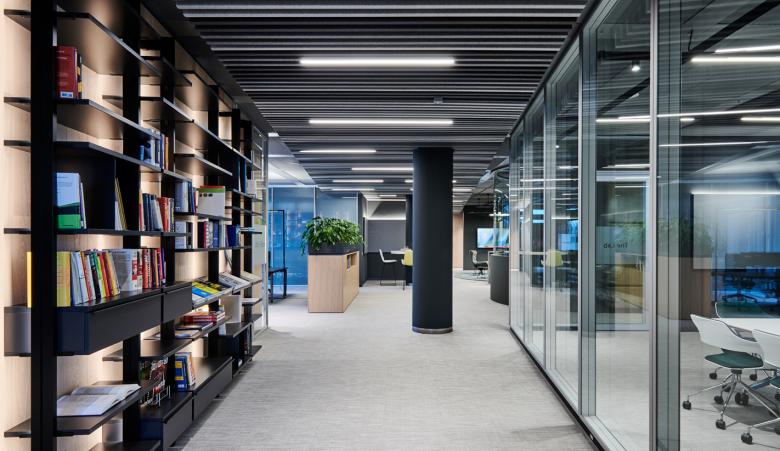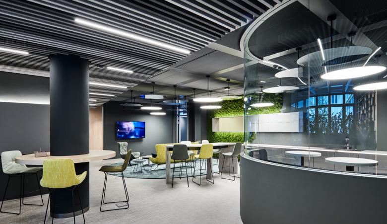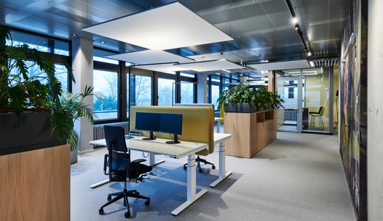 Einem einzelnen Mitarbeiter zugeordnete Arbeitsplätze gibt es nicht mehr. Vielmehr bucht sich jedes Teammitglied den Platz oder Raum, der ihm für seine zu erledigenden Aufgaben der richtige scheint. Unterstützt wird die gewünschte räumliche Stimmung durch ein außergewöhnlich komplexes, hoch variables Beleuchtungskonzept.