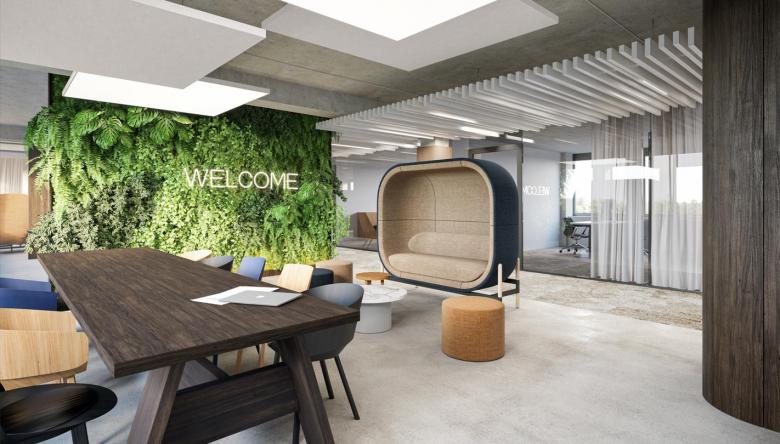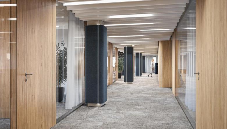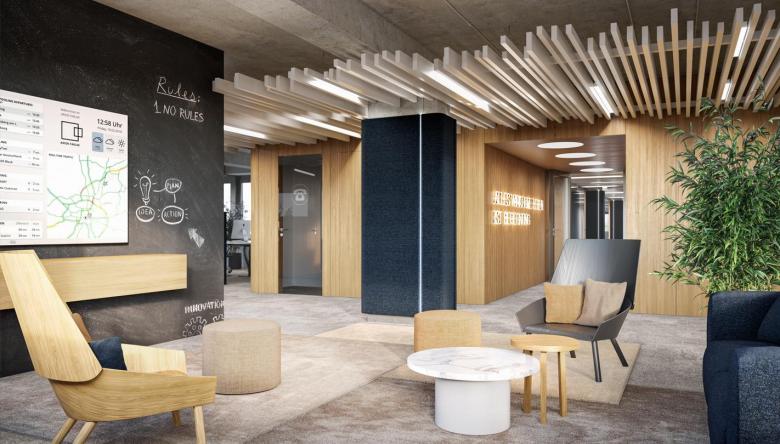 Eine 1000 qm große, konventionelle Bürofläche wird in einen modernen Office Space für ein 40-köpfiges Team umgewandelt. Die Anforderungen an die einzelnen Raumbereiche sind höchst unterschiedlich. Manfred Haverkamp verwob diese Funktionen zu einem fließenden Raumkörper mit immer wieder interessanten Perspektiven und einer lockeren, collagehaften Möblierung.
