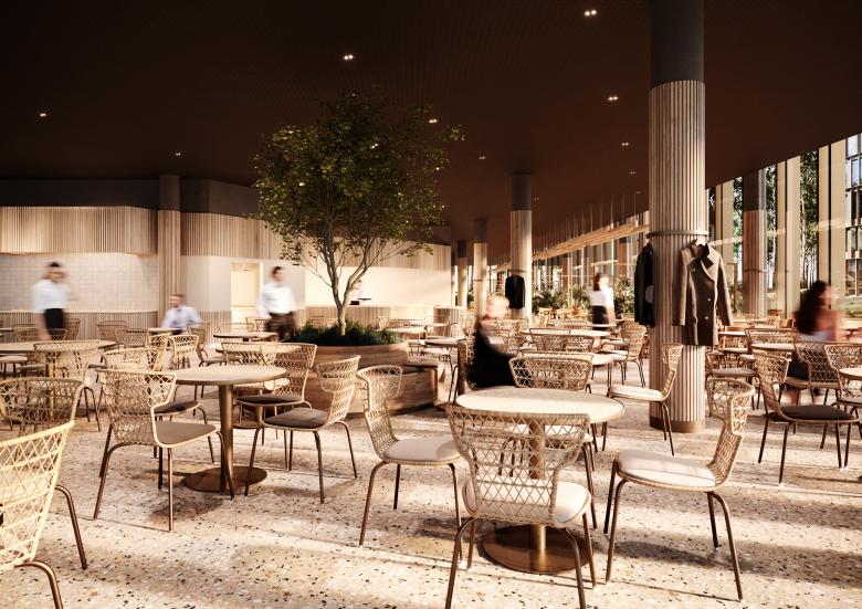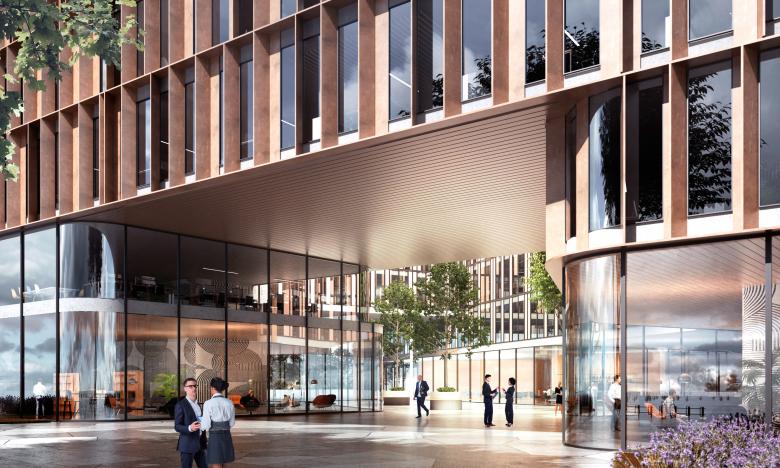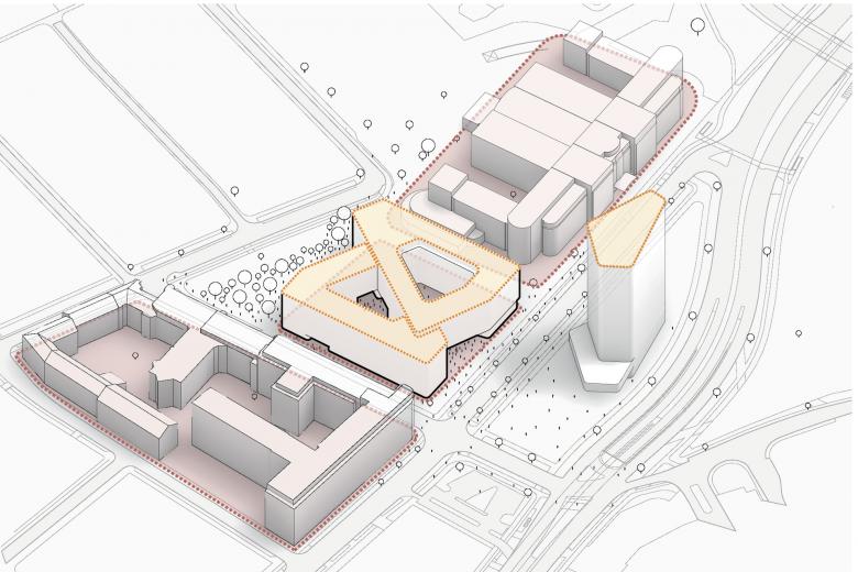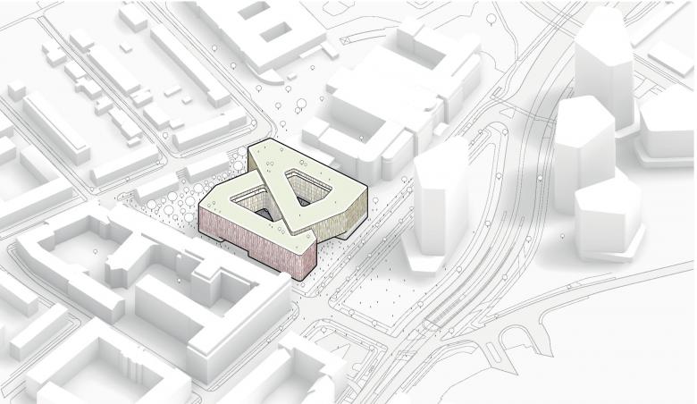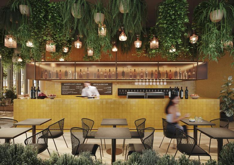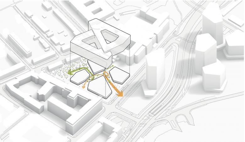 Das Multi-Tenant-Gebäude mit sieben und acht Stockwerken bietet flexibel nutzbare, unterschiedlich große Büromietflächen. Im Erdgeschoss sind Gewerbeflächen, gastronomische Einrichtungen – etwa Supermarkt, Bäckerei und Café – und ein Fitnessstudio vorgesehen, die sowohl für Nutzer*innen als auch Anwohner*innen der umliegenden Bauten zugänglich sind. Urbane, trapezförmige Innenhöfe und begrünte Dachflächen mit Alpenblick dienen als Arbeitsplatz im Freien, als Räume für Austausch sowie der Naherholung.
