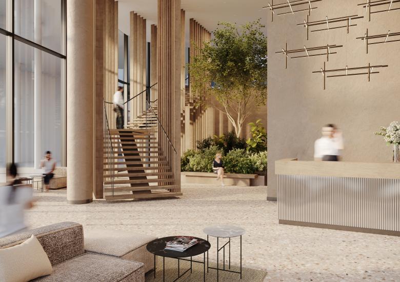 Für die öffentlichen Bereiche hat das Architektur- und Designbüro Matteo Thun & Partners ein Interior-Konzept entwickelt, das von der Natur bayerischer Landschaften inspiriert ist. Als Leitmotive dienen Wälder, Berge, Seen und Wiesen für die Gestaltung der vier Bürofoyers. Dabei kommen dezente Farben, natürliche Materialien und organische Formen zum Einsatz.