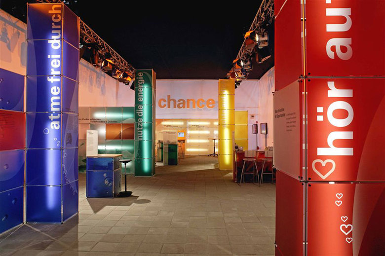 Die "Gesundheitsbox" ist eine begehbare "Tablettenschachtel". Im Inneren der Box wird gezielt über die großen Volkskrankheiten aufgeklärt. Der Besucher kann über Untersuchungen seinen Gesundheitszustand überprüfen. auf der Galerieebene finden Meetings und Vorträge statt.