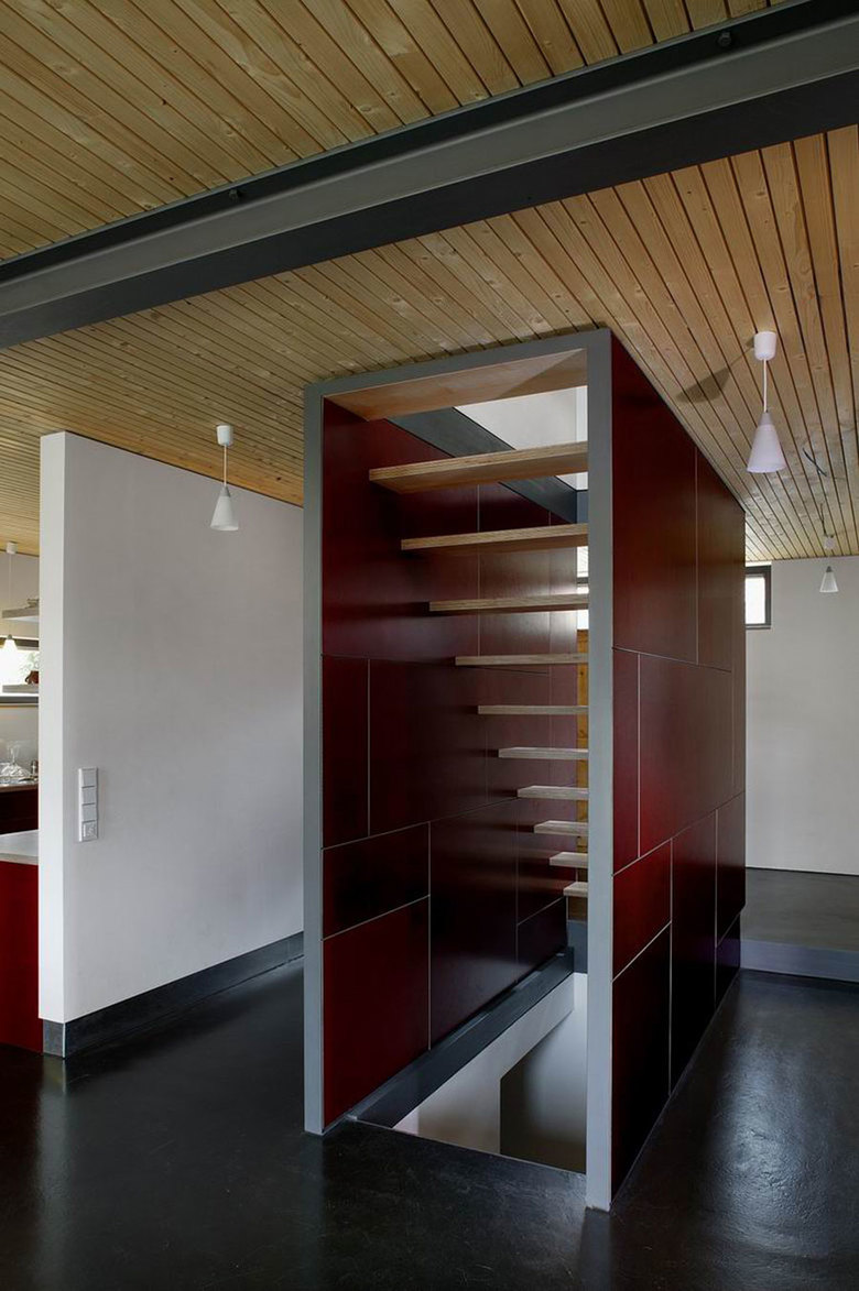 Der Neubau auf den Kellerwänden eines bestehenden Fertighauses wurde ab Auftragserteilung in nur vier Monaten bezugsfertig im Kenntnisgabeverfahren erstellt. Die Verkleidung des klaren Baukörpers mit horizontalen Holzlamellen löst das Volumen der geschlossenen Wandflächen auf, die Faltläden erzeugen ein sich kontinuierlich veränderndes Bild des Hauses und lenken den Blick in die Ferne. Die Bewohner sind Musiker, durch den separaten Eingang können Schüler in den Musikzimmern im Untergeschoss empfangen werden. Im Erdgeschoss orientieren sich die kommunikativen Aufenthaltsbereiche in einer offenen Raumkonzeption zum Garten und der eingestellten Treppenanlage hin. Ein Gästezimmer mit Bad ist dem Erschließungsbereich angegliedert. Im Obergeschoss befinden sich Schlafräume und das Badezimmer. der diffusionsoffene Wandaufbau des Holzrahmenbaus ergibt in Zusammenhang mit dem massiven Gussasphaltboden ein ausgeglichenes Raumklima. Die decke wurde als Brettstapeldecke ausgeführt, da neben der Zeitersparnis so eine gute Schalldämmung und eine Kostenreduktion in den Ausbaugewerken erreicht werden konnte. Insgesamt wurden ausschließlich baubiologisch unbedenkliche Materialien verbaut.