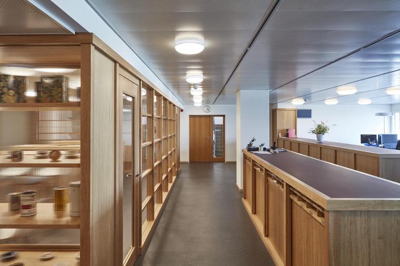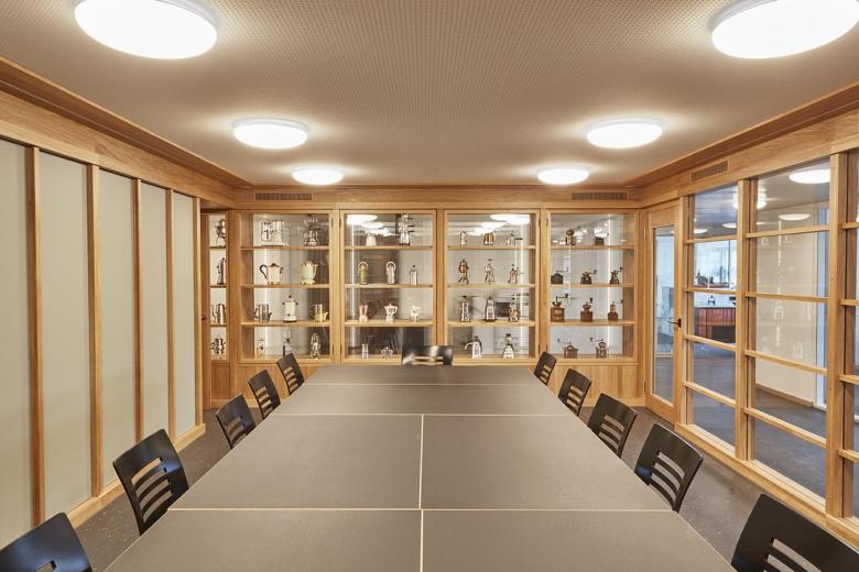 Seit der Gründung im Jahr 1922 ist Blaser Café in Familienhand und wird heute in der 4. Generation geführt. 1975 zieht die Firma Blaser Café an die Güterstrasse 4 in ein altes Bierdepot. 1981 werden die alten Gebäude abgerissen und ein siebengeschossiger Neubau entsteht direkt an den Bahngleisen zwischen dem Bremgartenfriedhof und dem heutigen Entwicklungsareal Warmbächli. Das Gebäude wurde 1981 vom Architekten Eduard Helfer entworfen und gebaut. 1997 wurde die Grundfläche des Gebäudes fast verdoppelt. Durch diese Verdoppelung gibt es eine grosse Mitte, die ohne Tageslicht auskommen muss. Die Erneuerung betrifft den Kundenbereich und die Aufenthaltsflächen der Mitarbeiter. Der gedeckte Aussenraum beim Zugang wurde dem Treppenhaus dazugeschlagen, als Foyer ausgebildet und mit einem Oblicht erhellt. Im Eingangsbereich wurde die bestehende Betonwand im Ausdruck vom beststehenden Gebäudesockel von 1981 zu den Parkplätzen ergänzt, gezeichnet wird dieser Sockel durch eine horizontale Bretterschalung. Durch das neue runde Oblicht aus Glasbausteinen wird das Foyer mit natürlichem Licht erhellt und aufgewertet. Eine neue Gestaltung des Zugangs im Erdgeschoss und die Signaletik begleitet den Besucher ins erste Obergeschoss. Im 1. Obergeschoss befindet sich der Empfang mit den Räumen Degustation, Pausenbereich für die Mitarbeiter, ein Besprechungsraum und diverse Büroarbeitsplätze inkl. Geschäftsleitung. Die Mittelzone wird mit einem Raummöbel in Sitzungszimmer, Degustation und Bistro Räumen gegliedert und abgetrennt. Dieses Raummöbel ist nicht nur Raumtrenner sondern bietet durch die Regale Ausstellungsfläche für die historischen Objekte sowie Präsentationsfläche für aktuelle Produkte. Weiter gibt es im Möbel Sitznischen sowie auch Nischen für Kaffeemaschinen, Kopierer, Drucker und einen Bildschirm im Sitzungszimmer. Die Einbauten wurden in Eiche furniert und mit Strukturglas ausgebildet, damit möglichst viel Tageslicht ins Rauminnere dringt. Die Kunden und Mitarbeiter diskutieren und degustieren zum 100 jährigen Jubiläum des Unternehmens in heller und freundlicher Atmosphäre.