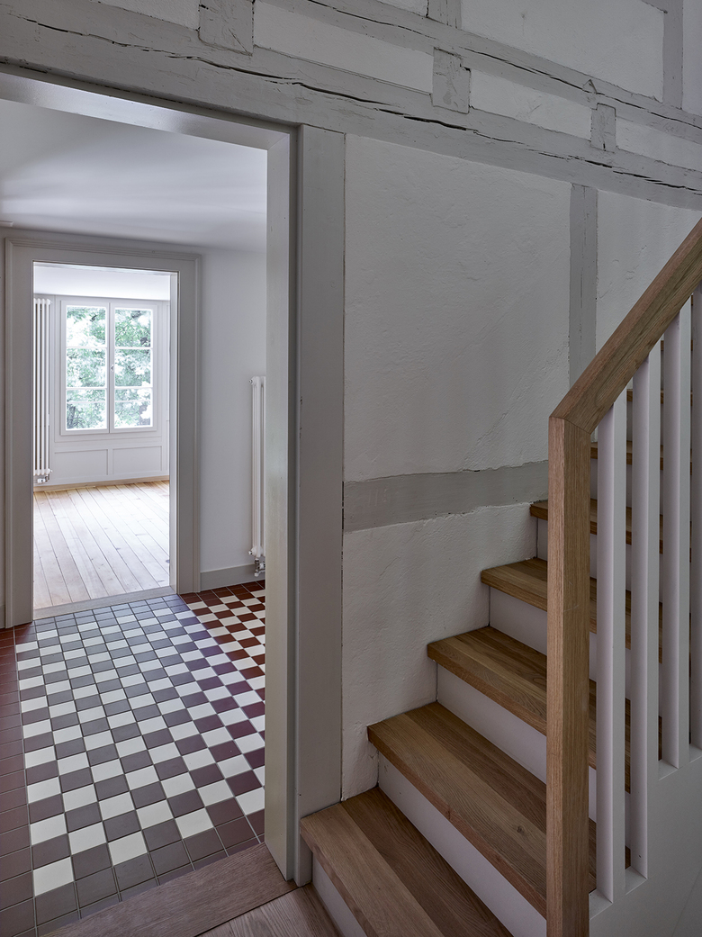 Ziel war die Beseitigung der baulichen Mängel, die energetische Optimierung des Gebäudes und die Steigerung der Wohnqualität durch eine räumliche Neuorganisation. Das Fachwerkhaus wurde mit einem Anbau ergänzt, so dass im Erdgeschoss eine 3.5-Zimmer-Wohnung und in den oberen Geschossen eine 4.5-Zimmer-Wohnung entstehen konnten. Dadurch war es einerseits möglich, zeitgemässe Wohnungsgrössen und eine quartierverträgliche Verdichtung zu erzielen. Andererseits konnte so die aussenliegende Erschliessung über die prägnante Laubentreppe bis ins Obergeschoss beibehalten werden.