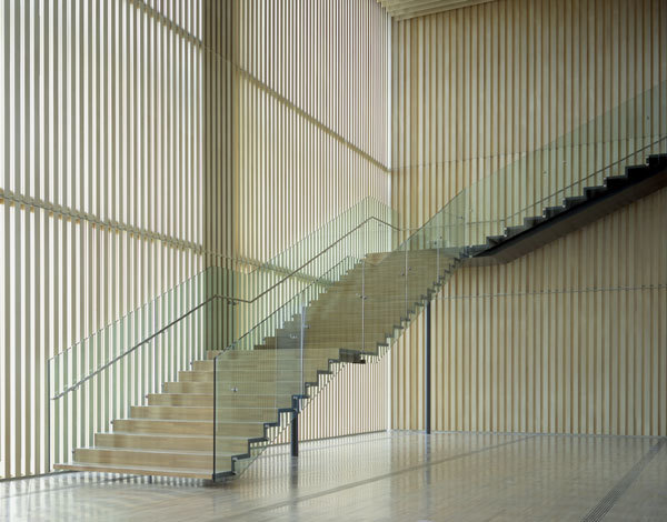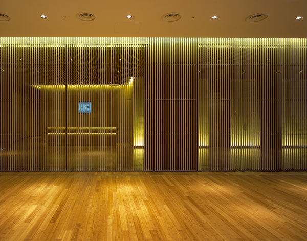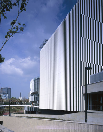 This entire building is covered with vertical louvers made of white ceramic panels. We chose this material based on the image of earthenware and porcelain pieces that compose the museum’s collection. Because ceramic panels are a rather weak material, they are usually thickened or set into concrete for enhanced strength; as a result they tend to be heavy and dull, a far cry from the delicate imagery of a tea bowl. In this project, however, a new method of reinforcing thin ceramic panels with aluminum extrusions made it possible to use extra-fine edges in the details. Our idea was to realize within a massive urban structure an image so fragile it seemed it would break if not treated with great care.