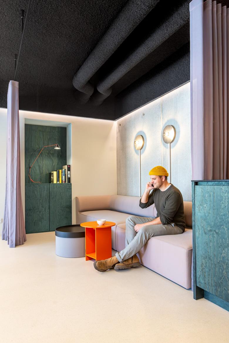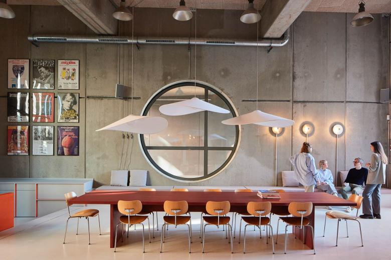 Gestalterisch? Zurückhaltung mit Haltung. Ein lichter Grauton zieht sich wie ein roter Faden durch Wände und Möbel, während das Orangerot der Corporate Identity den großen Auftritt übernimmt – zum Beispiel in der Wendeltreppe, die nicht nur verbindet, sondern auch Instagram-tauglich ist. Das Foyer? Bühne, Treffpunkt, Rückzugsort – alles gleichzeitig.