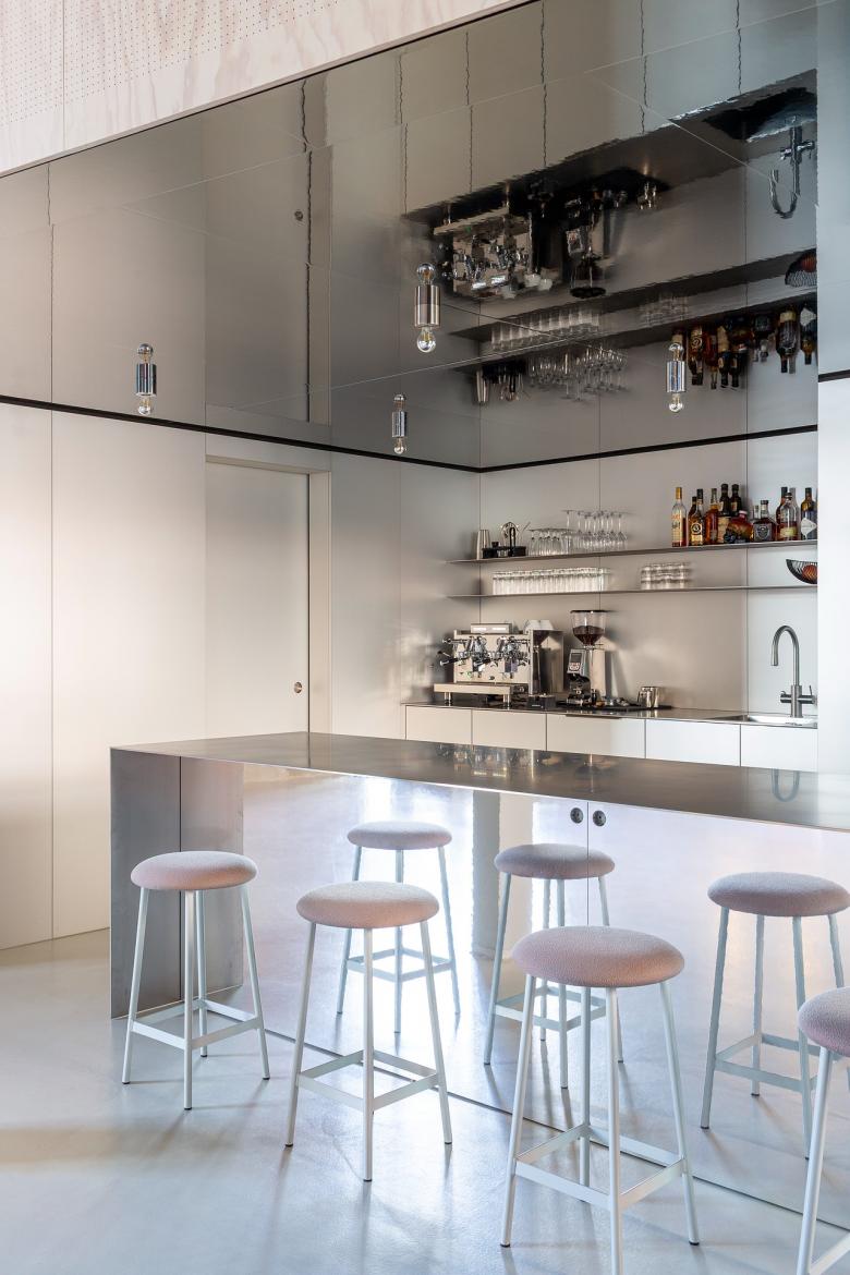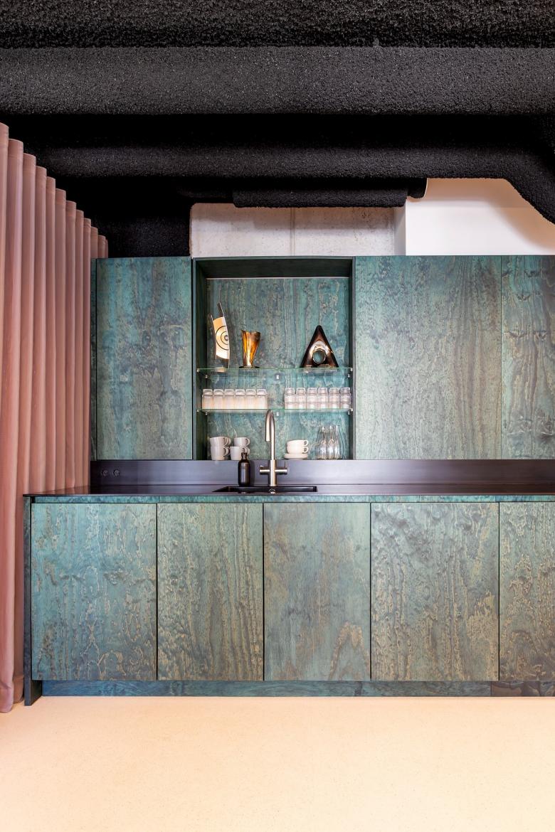 Spiegeldecken öffnen den Raum, dunkelgrün lasierte Schrankwände bringen Tiefe, Pflanzen sorgen für Leben. Akustik-Spritzputz an der Decke macht den Sound so smooth, dass selbst die lautesten Ideen leise wirken.