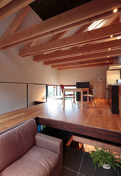 For this residence, we focused on two components within the existing floor plan of this two-storey wooden structure that tend to be neglected – the roof space above the ceiling, and the portion underneath the floor. The first step was to divide the roof and floor on each level into an upper and lower portion. By freely carving out a part of each of these upper and lower portions, several spaces were created – a dining area, a place for relaxing, and a workspace. In contrast, the gouged-out holes helped to frame free, unobstructed lines of sight that created gentle links between the different spaces. The in-between gaps that belonged to neither of these spaces could then be used for storage purposes, in addition to indirectly helping to augment the floor area of the living space.