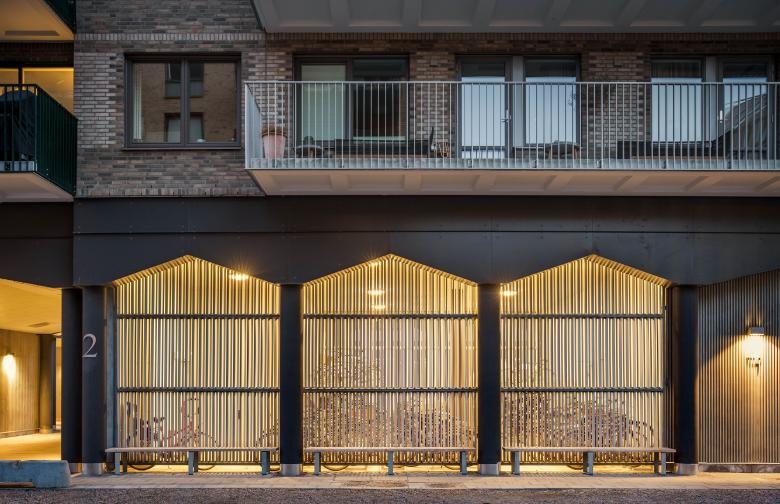The block comprises five buildings, distinct in their individual design but with a consequent materiality, creating a lively yet cohesive composition.
