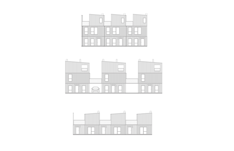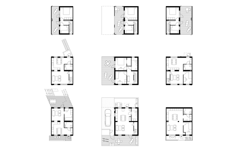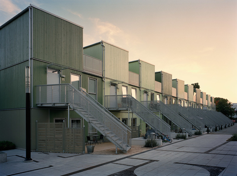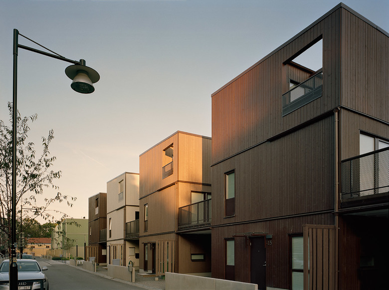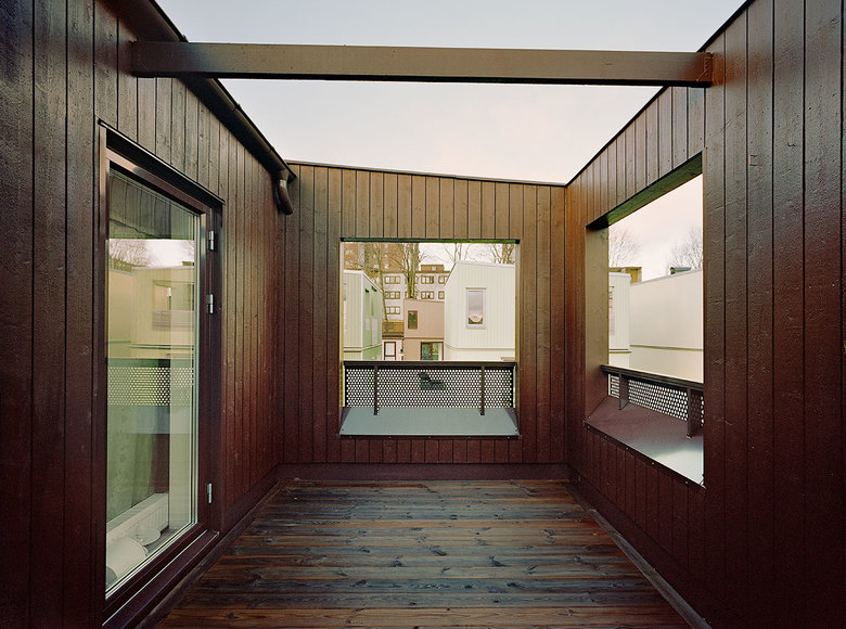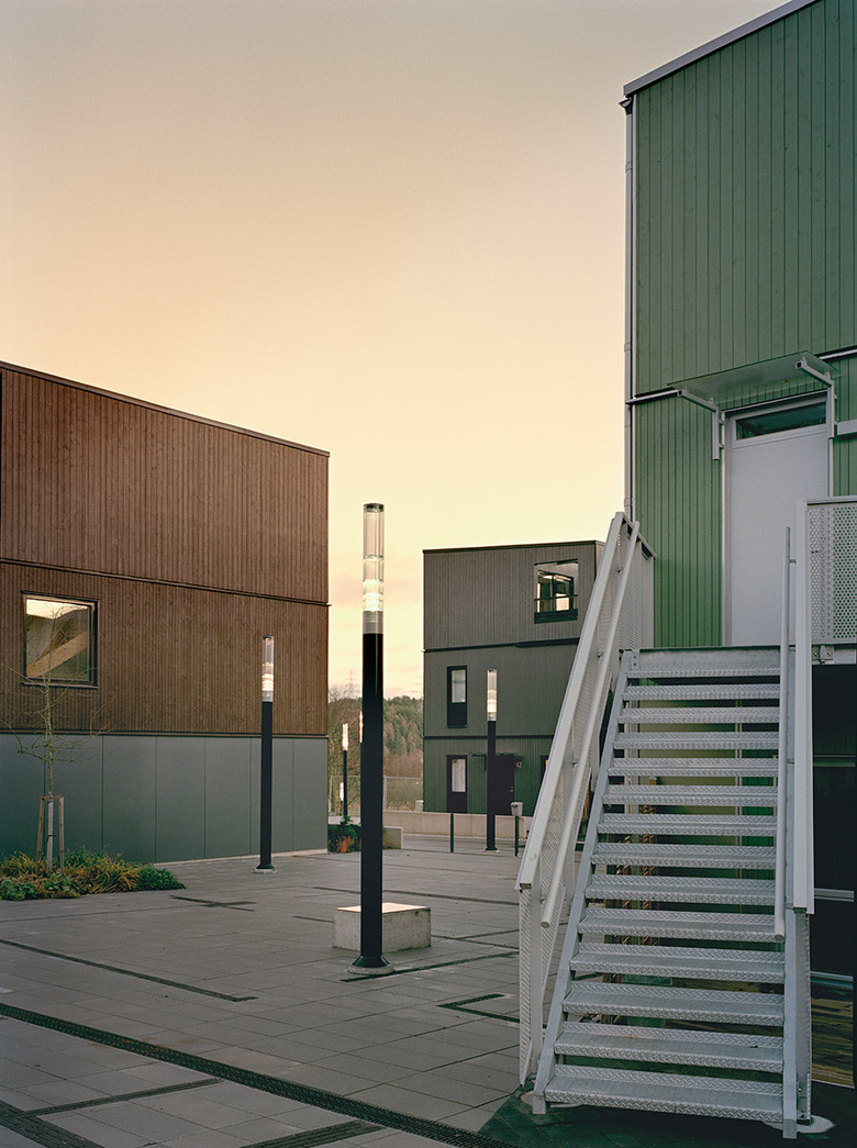 The buildings are constructed with prefabricated timber elements. Few but flexible module types have been combined to create variety. The exterior treatment of stained timber panels, of alternating width and colour, references nature and the existing fabric.