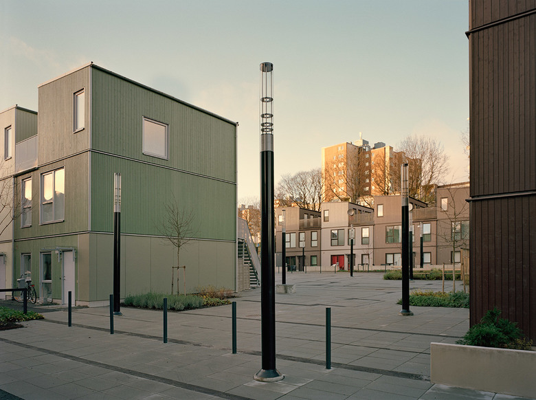The housing units vary from one-room studios to efficient 4-6 room apartments and terraced houses. A focus has been on generation-living strategies, offering possibilities for large families and relatives to live within the area. New streets are shared-space environments, where the surface treatment from the diagonal space extends onto adjacent streets.