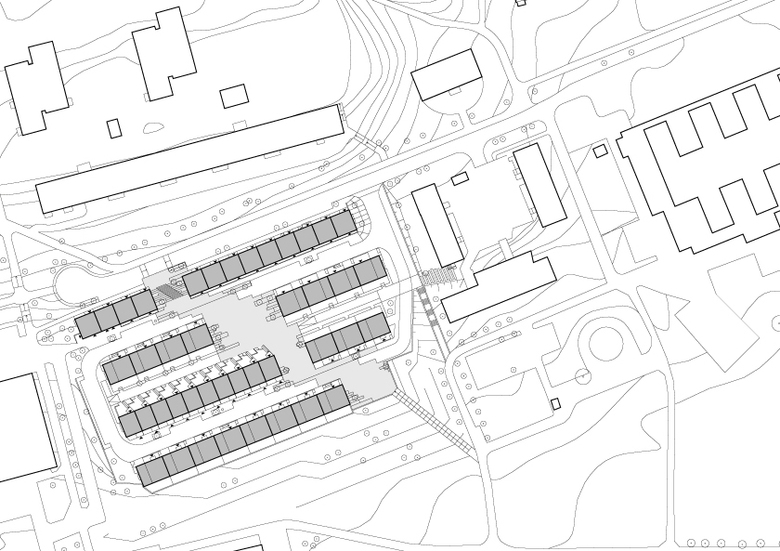 The site is set on a terrace above the landscape sloping towards the water. The main idea is to connect the three distinct spatial characters and scales of the setting: the local centre, the common meadow and the band in-between, consisting of low-rise community functions i.e. school, pool and park structures. A diagonal sequence is created through a series of informal public spaces, which opens up visual access and connects pedestrian movement through the terrace blocks. The central square is filled with everyday functions and city life. Private spaces are located on different levels as roof terraces, intimate gardens and entry spaces.