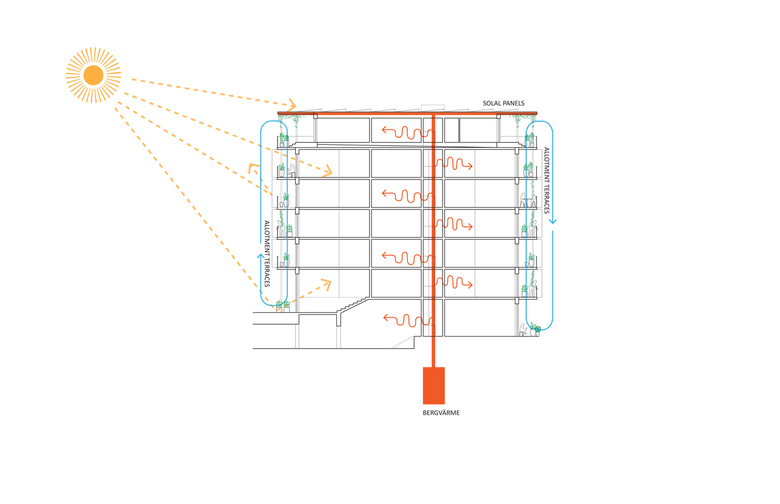 The project responds to the City's specified requirements for an interesting architectural cutting-edge project in Norra Djurgårdsstaden's ongoing development in terms of housing-, energy-and environmental issues. The energy and the environmental criteria consist of net-heat, self-sufficient renewable energy, LCA-screening (life cycle assessment) and Green Space Factor. The buildings are maximized from an energy perspective, so-called plus-energy houses which are designed to produce an energy surplus, giving electricity back to the grid.