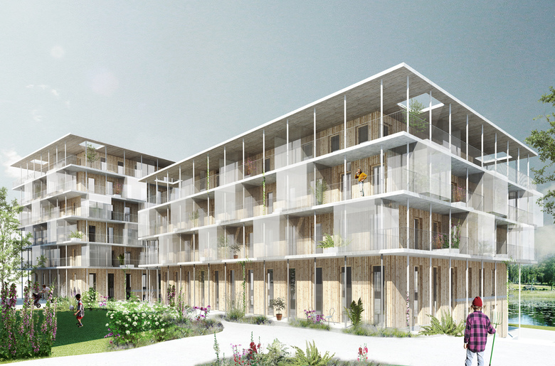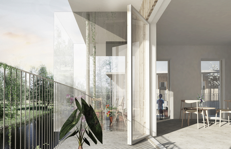 The point of departure is a strong plan geometry and structure, designed to be flexible over time. A clear inner core with a flexible outer zone, offers sub-dividable dwellings within a continuous gallery. The light, natural timber facades provide a backdrop to the longitudinal balconies on pillars, which invite the residents to cultivate and offers extended seasons throughout the year with its green-houses and integrated plant boxes.