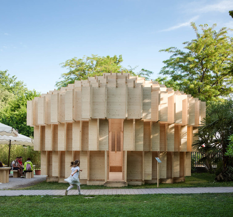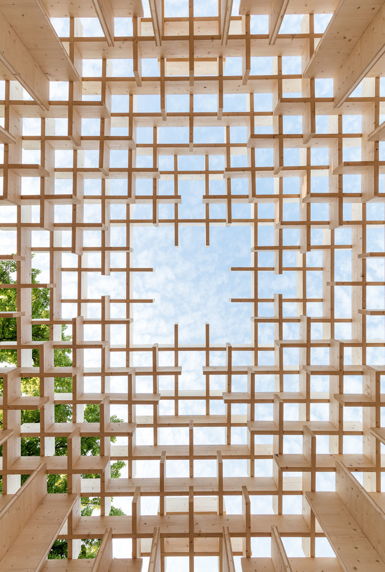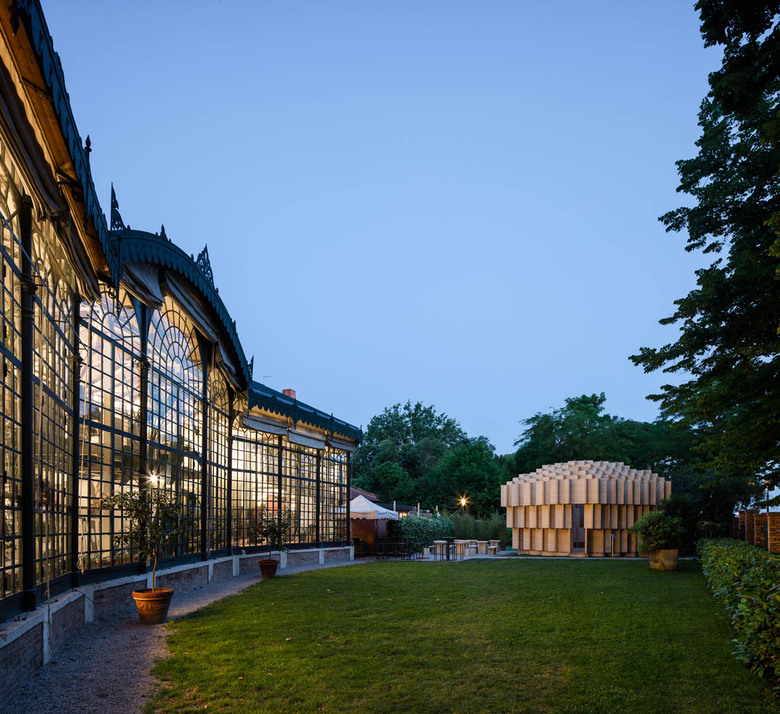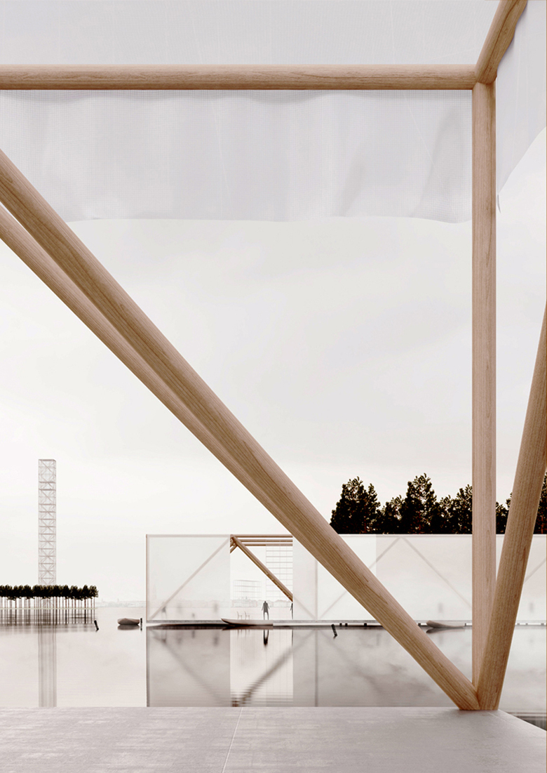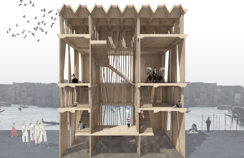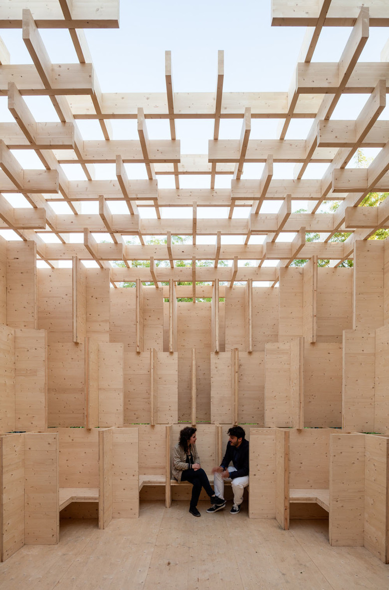 In dialogue with one of the most public buildings in Venice - the Doge's Palace, the pavilion becomes a kind of forested place of respite resembling a glade in a forest, with filtered light and acoustic presence.