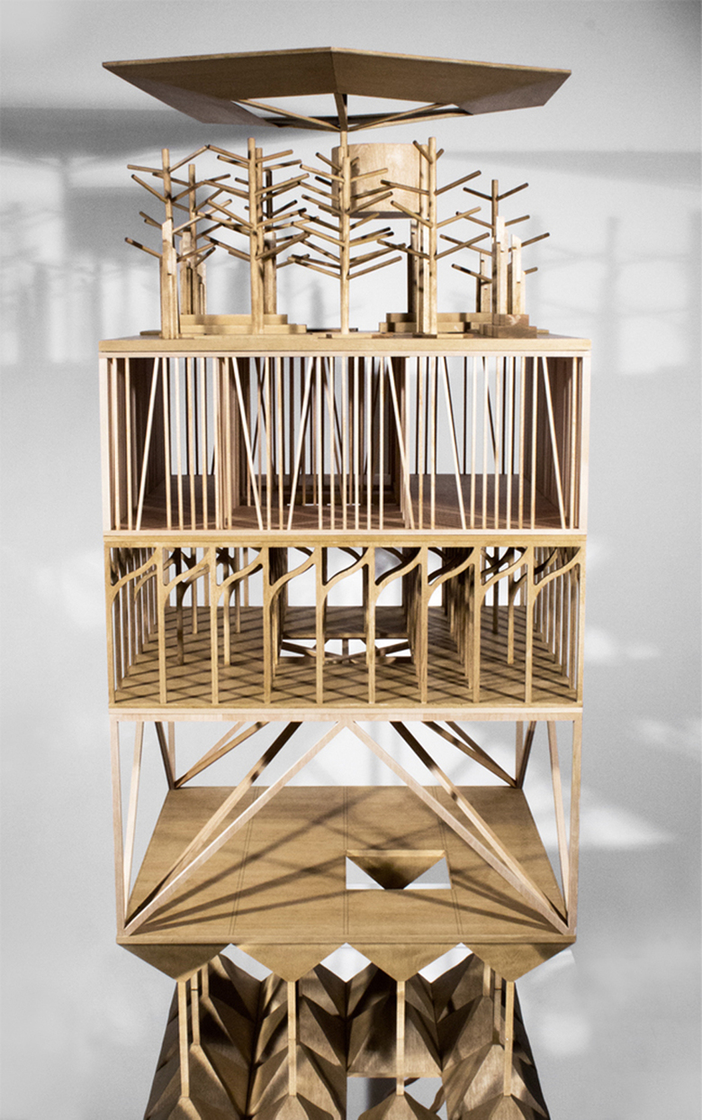 The Forests of Venice extends inside the greenhouse where classical Venetian architectural and urban elements are interpreted and translated into new strategies for our time, using wood as the driving material of investigation.