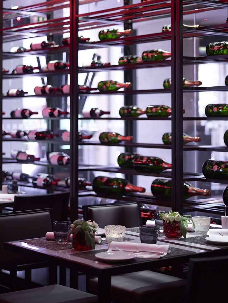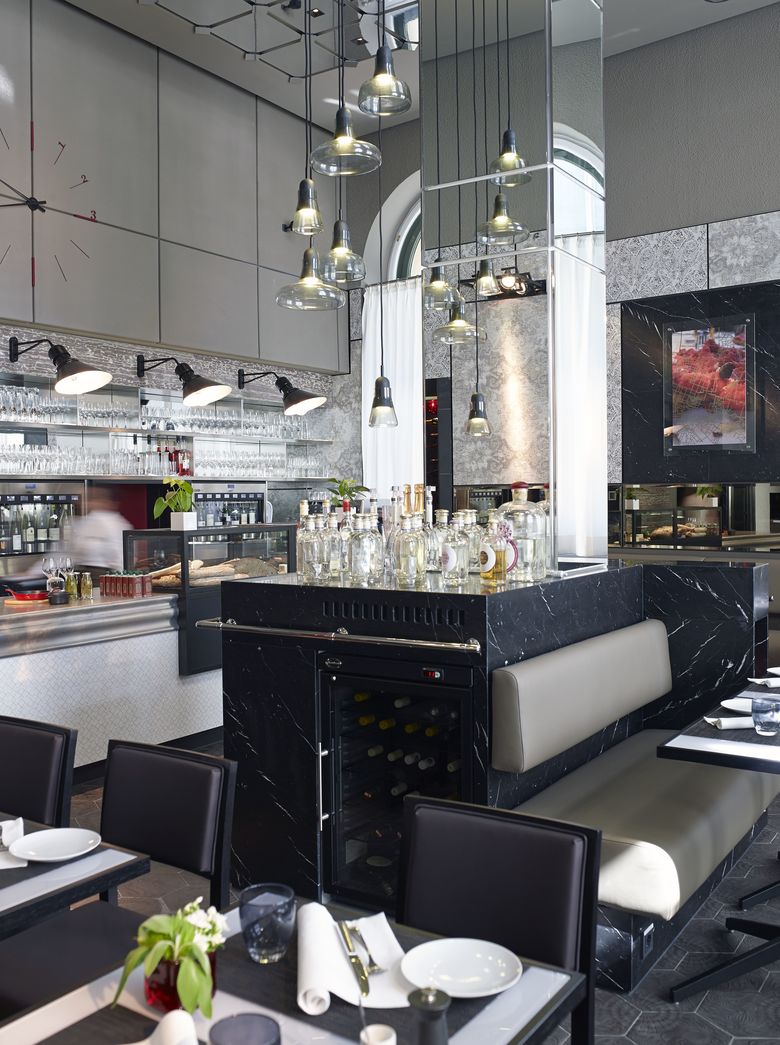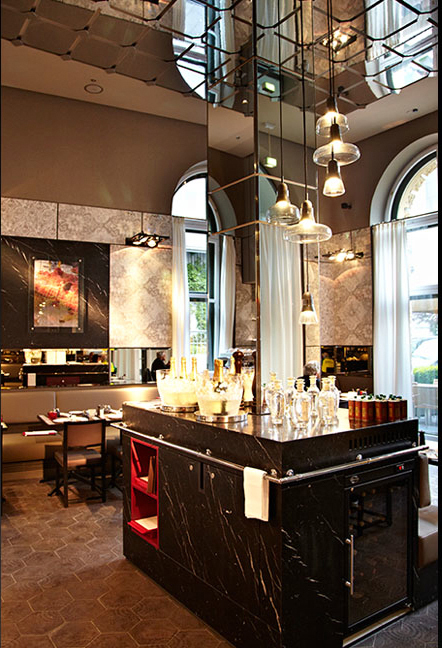 Der Blickfang des vorgelagerten niedrigeren Weinraums ist die raumhohe Weinwand die sich über die gesamte Länge des Raums erstreckt. Durch die offenen Weinstellagen und die farbig- getönte Glaswand wird ein Sichtbezug zum Eingangsbereich des Hotels geschaffen. Die Atmosphäre einer traditionellen Brasserie in den Kontext der heutigen Zeit zu setzten war eine große Herausforderung. Klassische Brasserie Materialien und Elemente wie Naturstein, Zementfliesen und Spiegel wurden formal modern umgesetzt und ungewöhnlich kombiniert. Luxuriöse Oberflächen werden neben Vintage-Oberflächen gesetzt und erzeugen so eine gewollte Nonchalance.