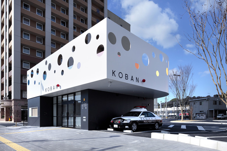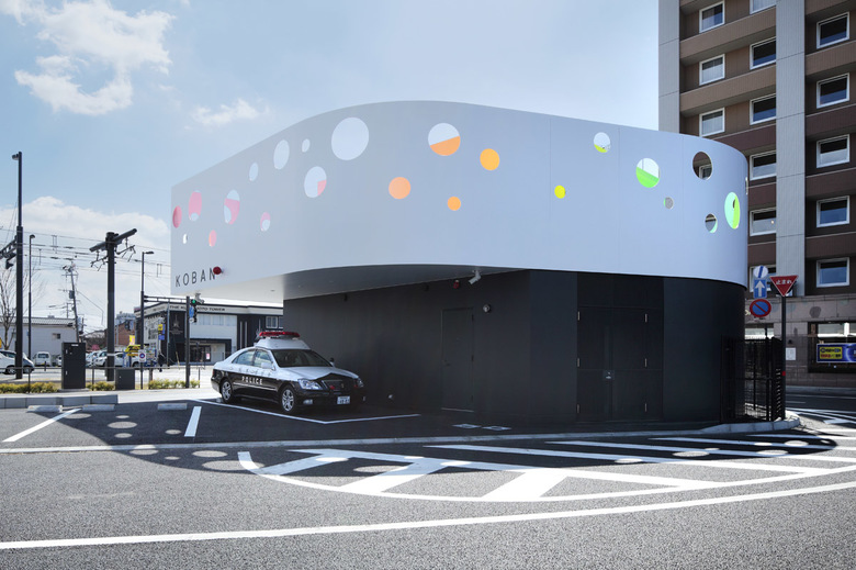新しい新幹線の駅前に位置するこの交番は、親しみやすく楽しいイメージを持ちながら地域のランドマークとして引き立つ存在である事を求められた。この要求に応えるため、私たちは建物の上部を穴の開いた帯状のスティールで覆い、その中に隠れる上層階と帯の内側に優しい虹色のグラデーションを施すことで彫刻のように独立した表現を与えた。この大胆なグラフィックは周辺全域から目にすることができ、穴から見える内壁の色は見る角度によって変化する。そして帯に開いた穴は交番を囲む道路へ影でできたパターンを描き出す。
