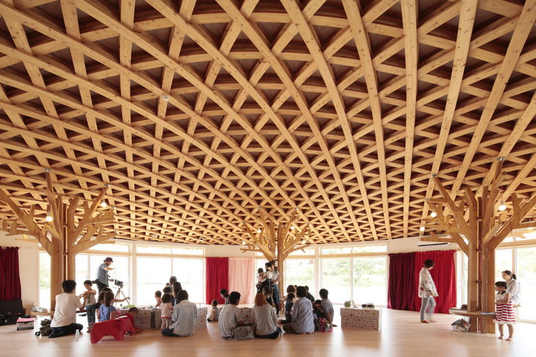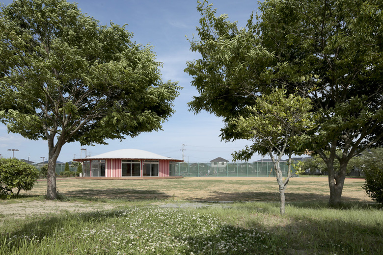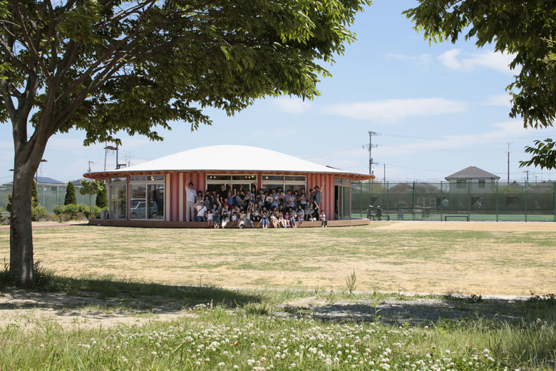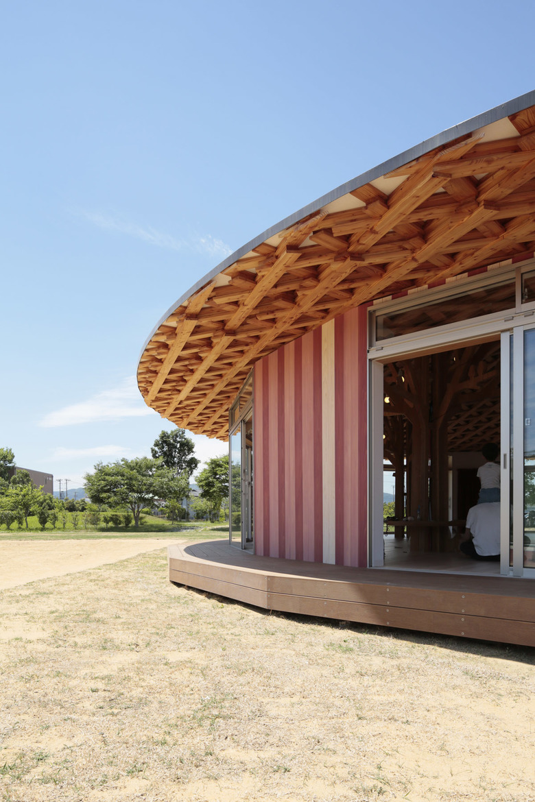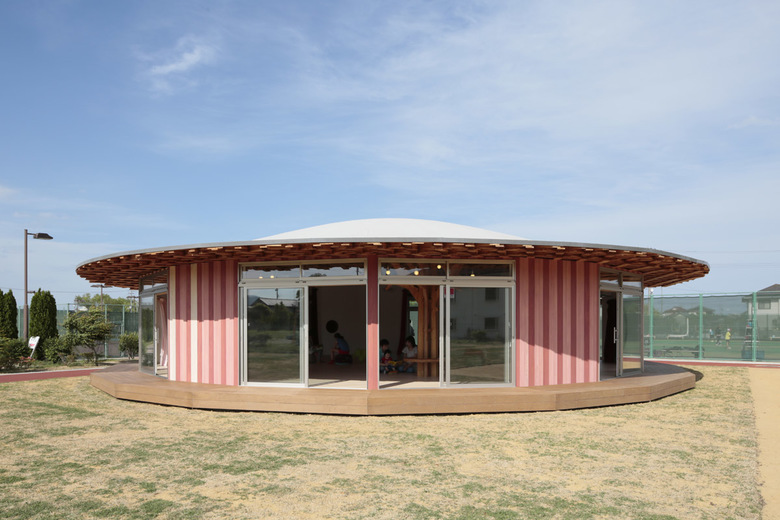公園の中にひょっこり現れる、紅白ストライプ柄が目を引く建物。まるで麦わら帽子のような屋根の形も、見る者の気分を楽しませる。屋根の内側には断面の小さい木材を編み込んだ構造や、木の形をした柱に動物がいるなど、遊び心のある建築的な仕掛けがたくさんある。