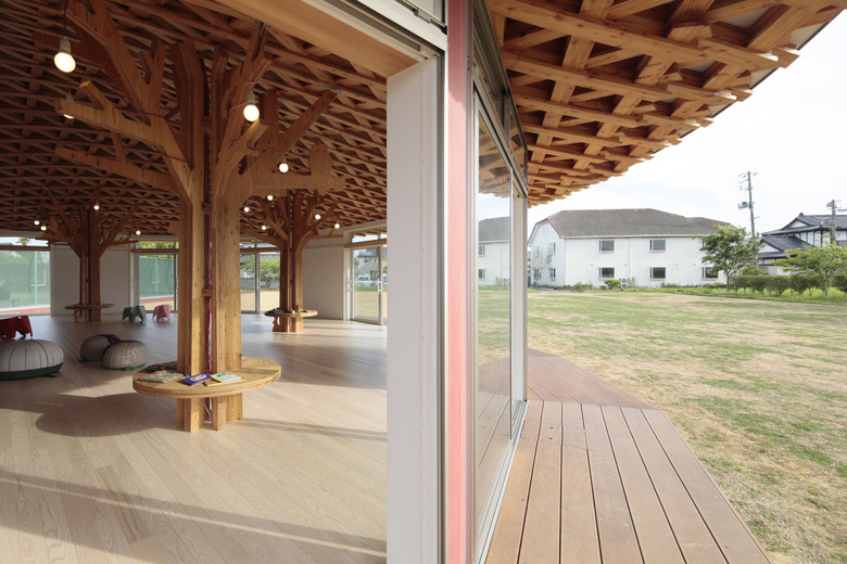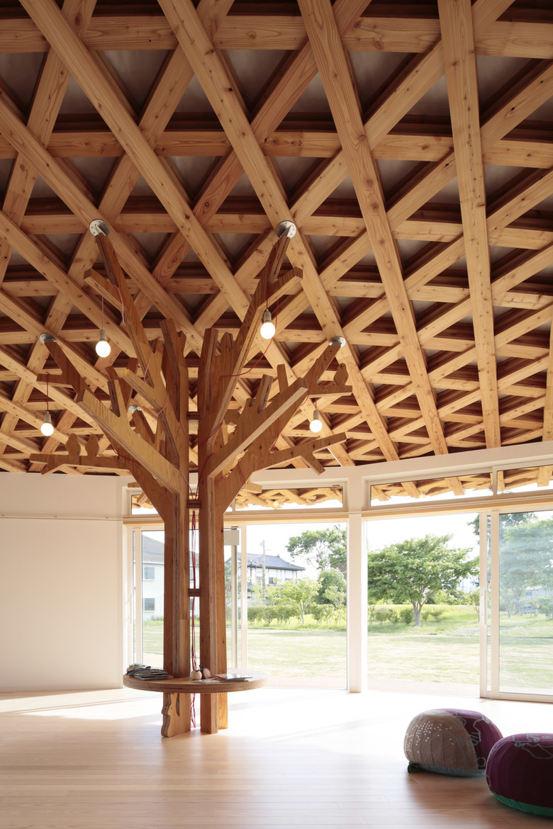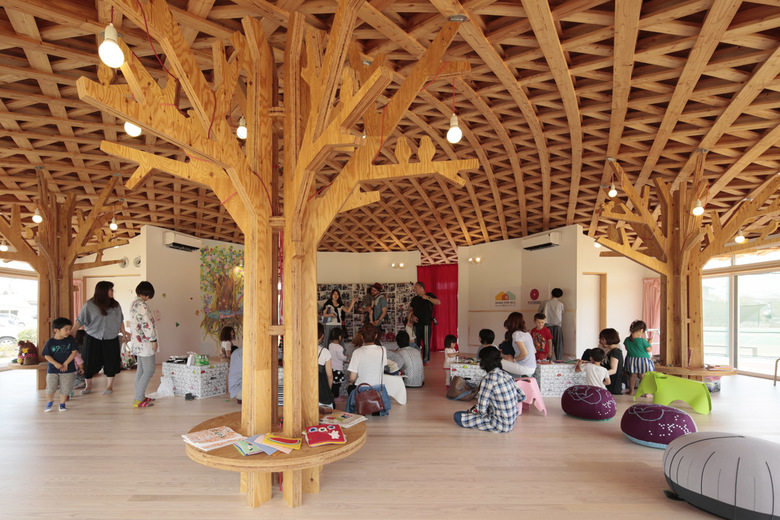 「相馬 こどものみんなの家」は、放射能の影響により外で遊ぶことをためらっていたこども達や、地面の上でこどもを遊ばせることを心配している保護者の方々が、安心して過ごせる室内の公園、森をイメージしてつくられた。