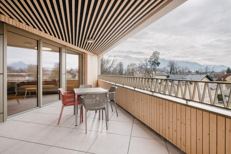 Die Loggien sind mit einer Holzverkleidung versehen um die Aufenthaltsqualität in diesen Bereichen zu stärken. Der Baukörper bettet sich damit harmonisch und ruhig in den umgebenden, gewachsenen Hintergrund mit dem imposanten Baumbestand ein.