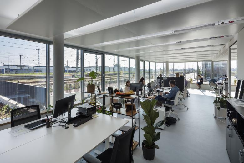 Während das Staffelgeschoss raumhoch verglast ist, umläuft die Regelgeschosse mit den Büroflächen eine Brüstungskante, welche durchgängig als Sitzfläche ausgebildet ist. Besonders im Co Working Bereich entstehen so weitere Me- und We places.