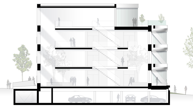 Der viergeschossige Neubau inklusive Tiefgarage (mit 50 Stellplätze und E-Ladestationen) und Dachterrasse ist komplett barrierefrei zu erschließen. Jedes Geschoss bietet flexibel einteilbare Büroeinheiten von 220 bis 900 m². Bis auf den Gebäudekern sind alle Wände frei plan- oder auflösbar. Von Einzelbüros bis zum Großraumbüro ist alles möglich. Diese größtmögliche Flexibilität in der Raumaufteilung ist für die Nutzer sehr attraktiv, da man schnell auf sich verändernde Mietgrößen reagieren kann.