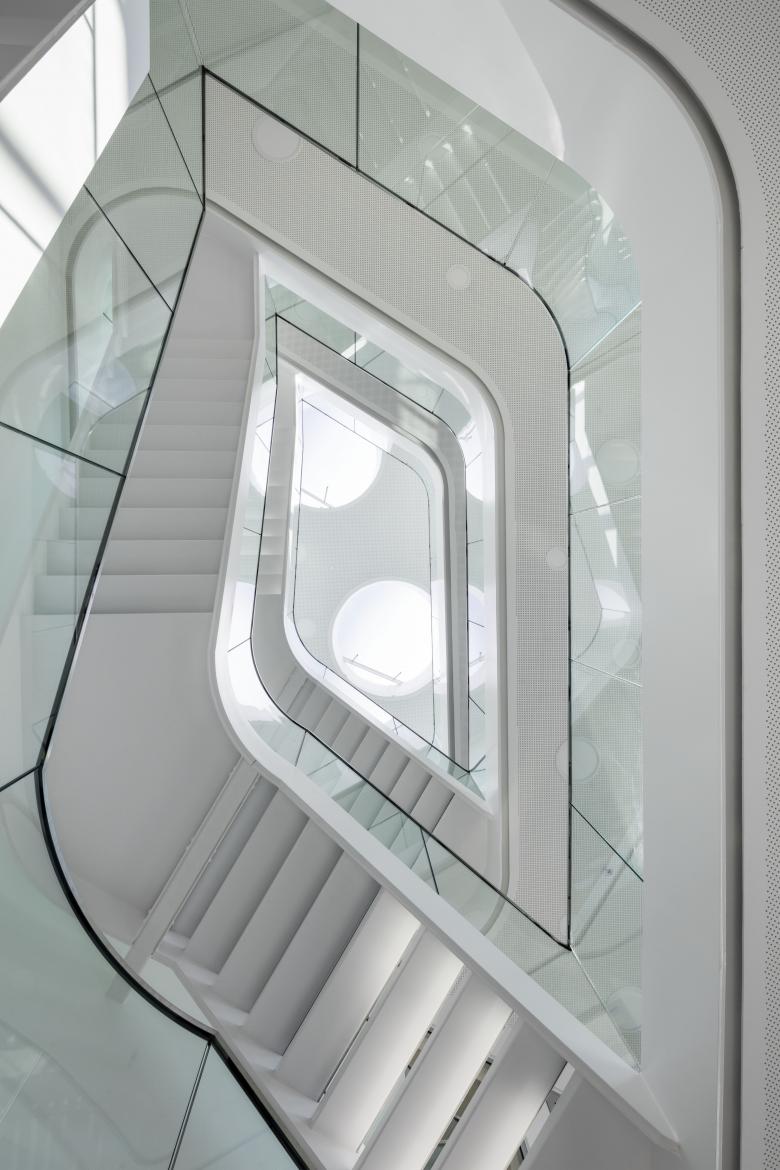 Der Sonnenschutz kommt ohne außenliegende Verschattungsanlagen aus und wird über modernes Sonnenschutzglas mit innen liegenden Sonnenschutz-Flächenvorhängen gesteuert.