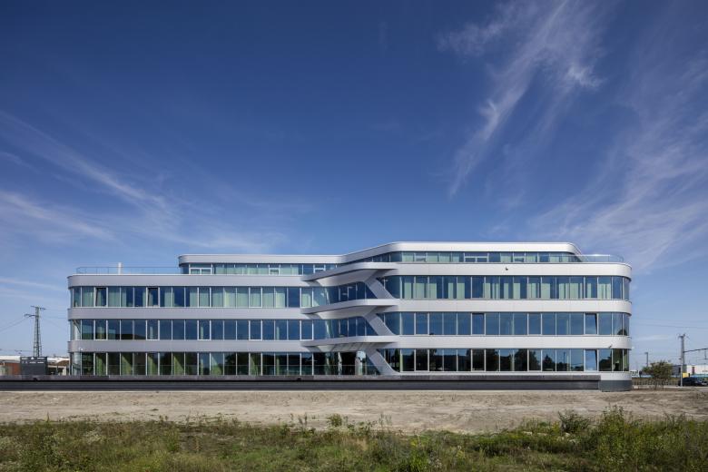 Der Umriss des Gebäudes weist keine rechten Winkel auf, nur runde Ecken. Die hinterlüftete Leichtmetallfassade mit Dreifachverglasung ist zunächst durch eine Bänderung horizontal gegliedert. Die strenge Horizontale wird aber durch schräg verlaufende Fassadenbänder und auskragende Fassadenelemente aufgebrochen. Durch die Metallstruktur gemeinsam mit den vielen Glasflächen erscheint das Gebäude sehr grafisch.