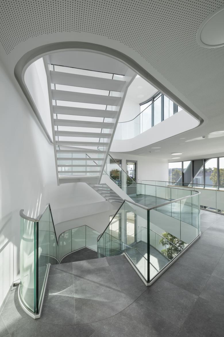 Auch im Inneren, besonders im begrünten Atrium, das sich über alle 4 Geschosse erstreckt, und durch das ein großzügiges Treppenhaus führt, erscheint das Haus mit seinen vielen Aus- und Durchblicken sehr hell und transparent.
